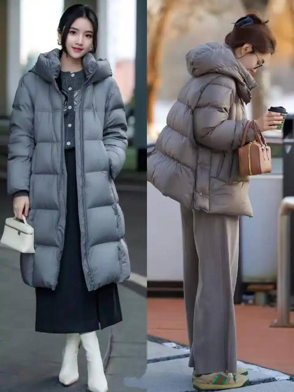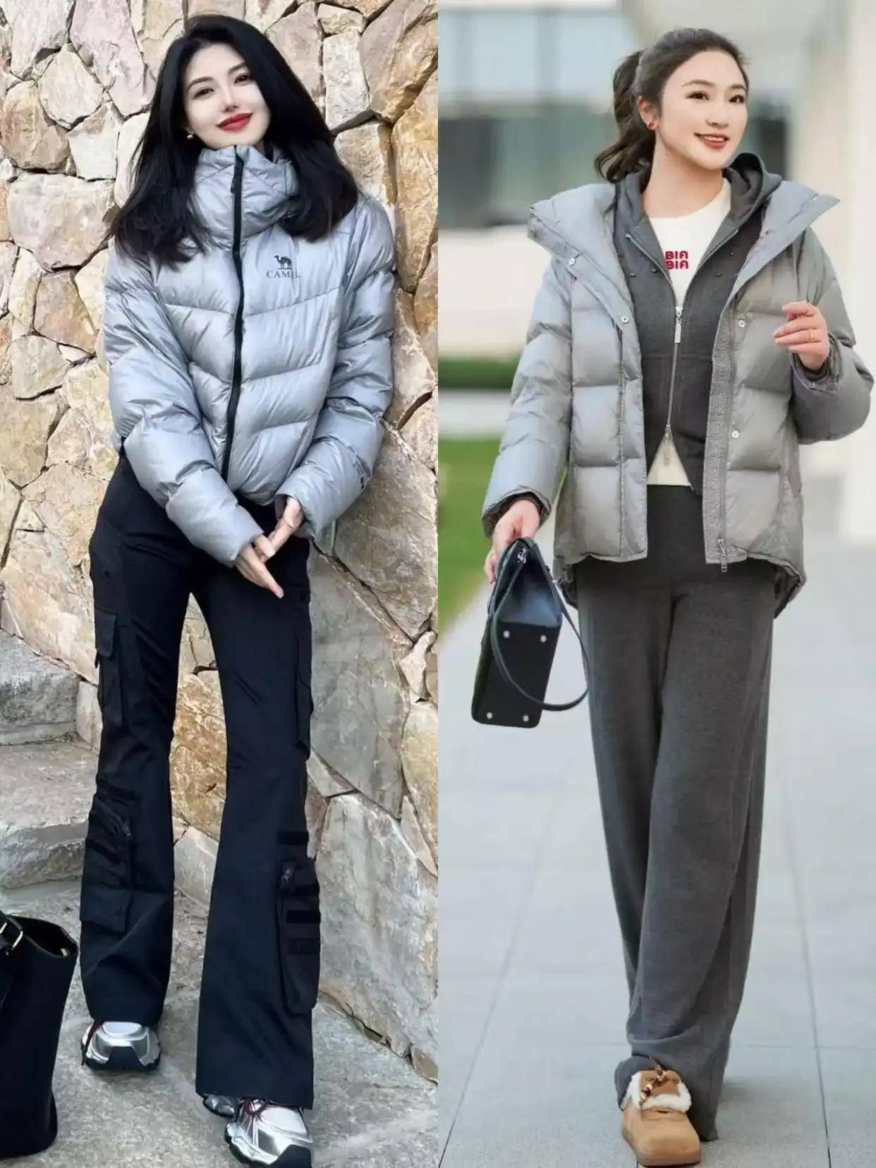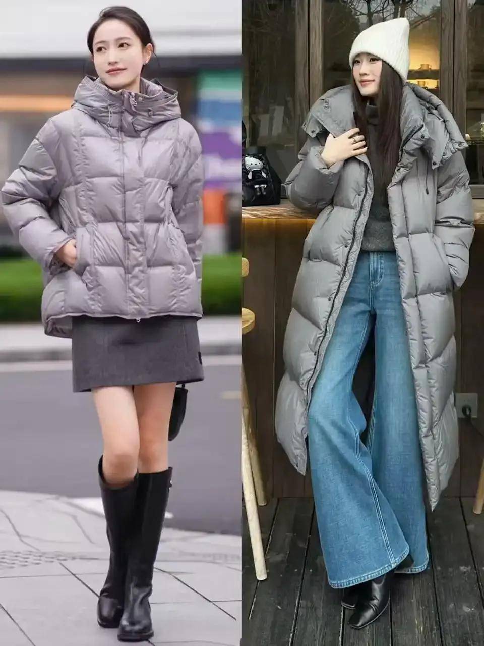 短款利落:衣角卡在胯骨位置的短款羽绒服(如灰色款)视觉拉长身形,搭配高腰裤/裙轻松显高。