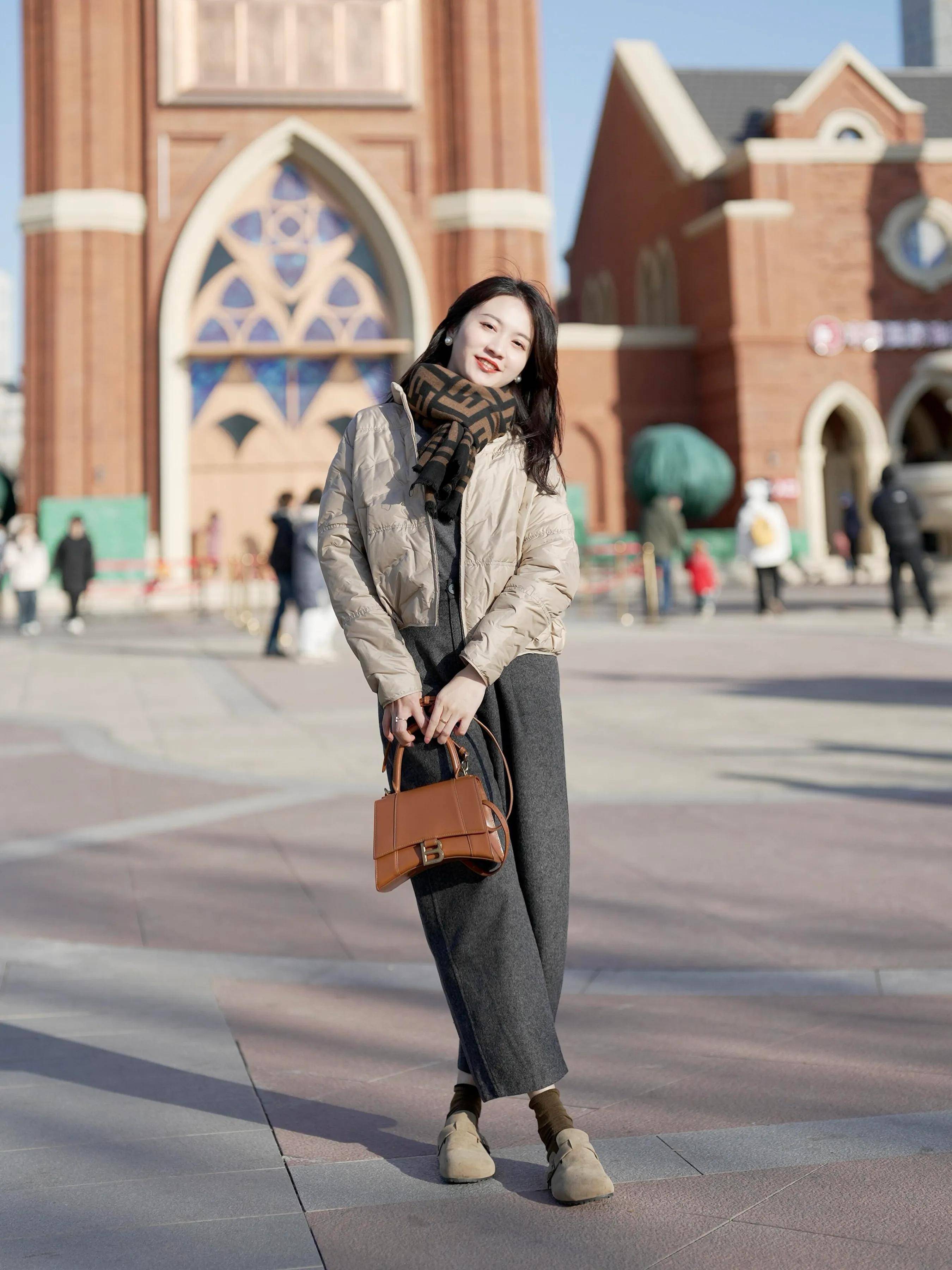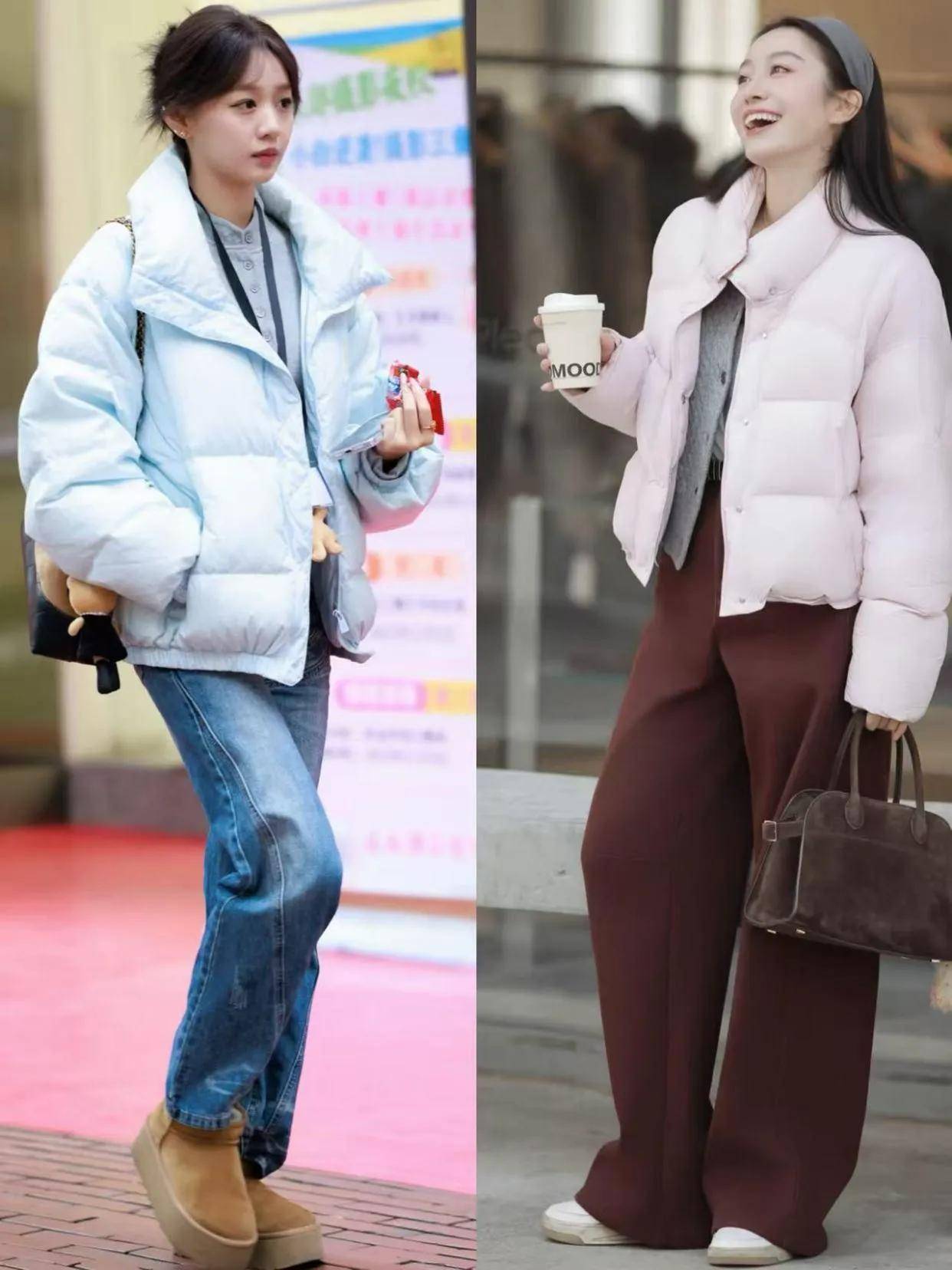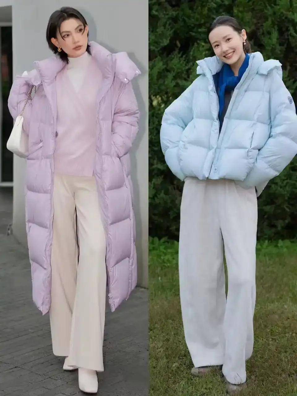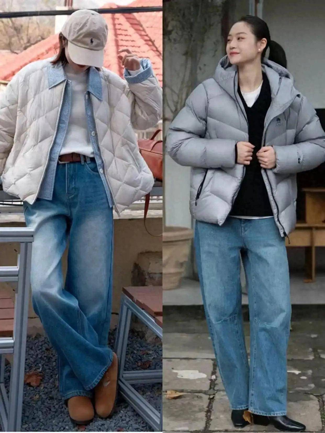 短款利落:衣角卡在胯骨位置的短款羽绒服(如灰色款)视觉拉长身形,搭配高腰裤/裙轻松显高。