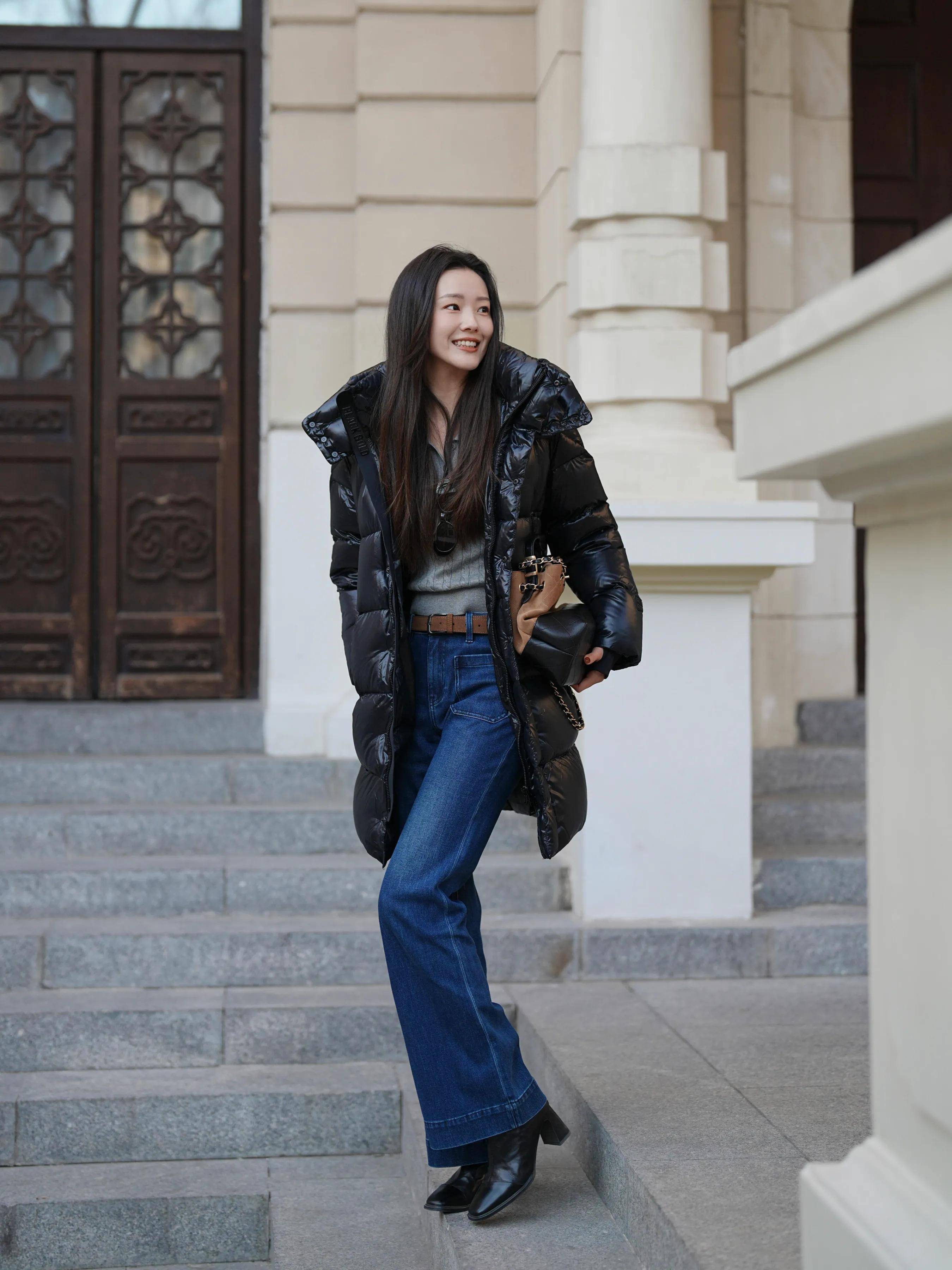 黑色羽绒服+灰色毛衣+蓝色直筒牛仔裤+黑色短靴:沉稳大气中注入随性活力,珍珠耳环提升精致度。