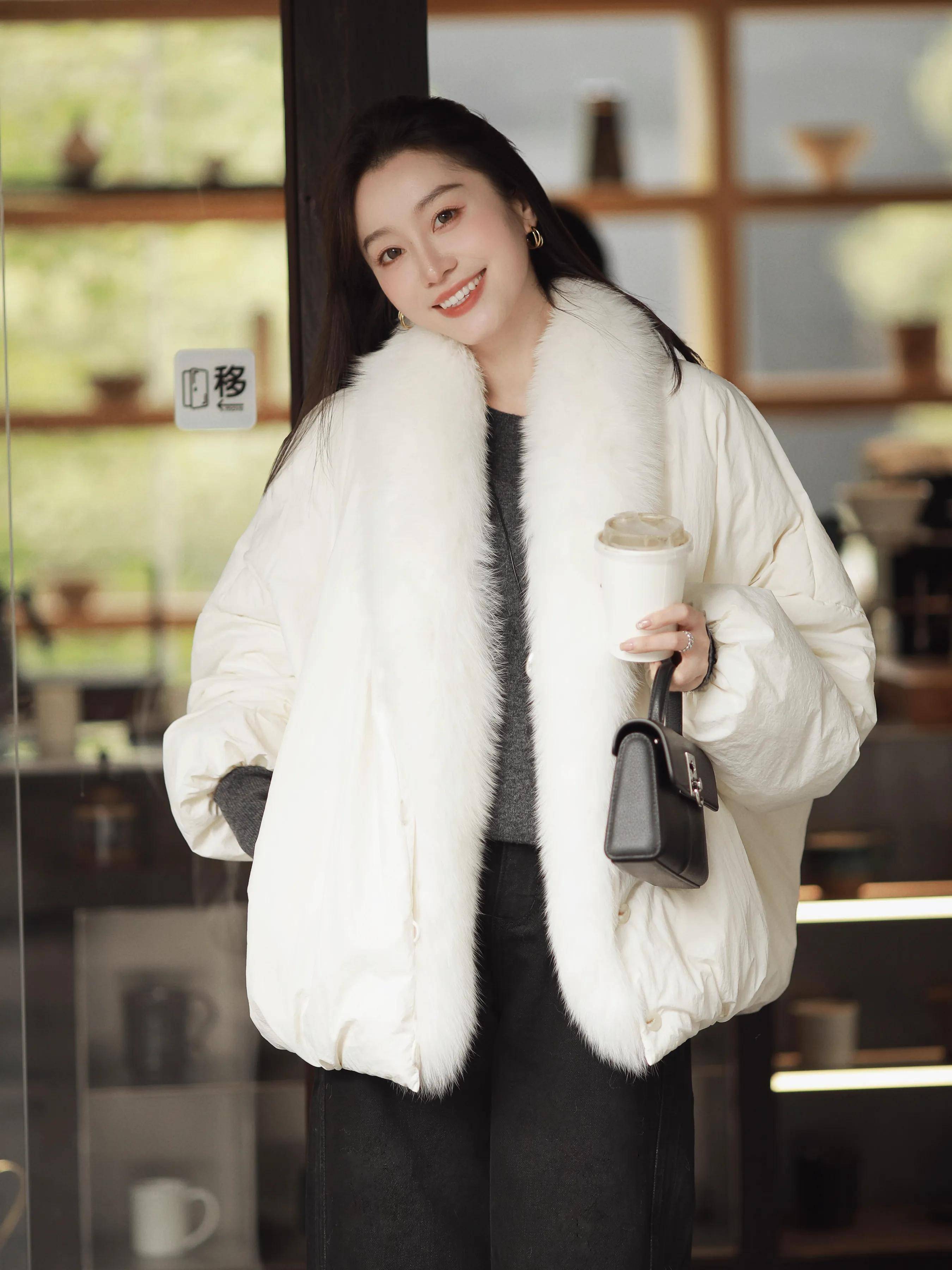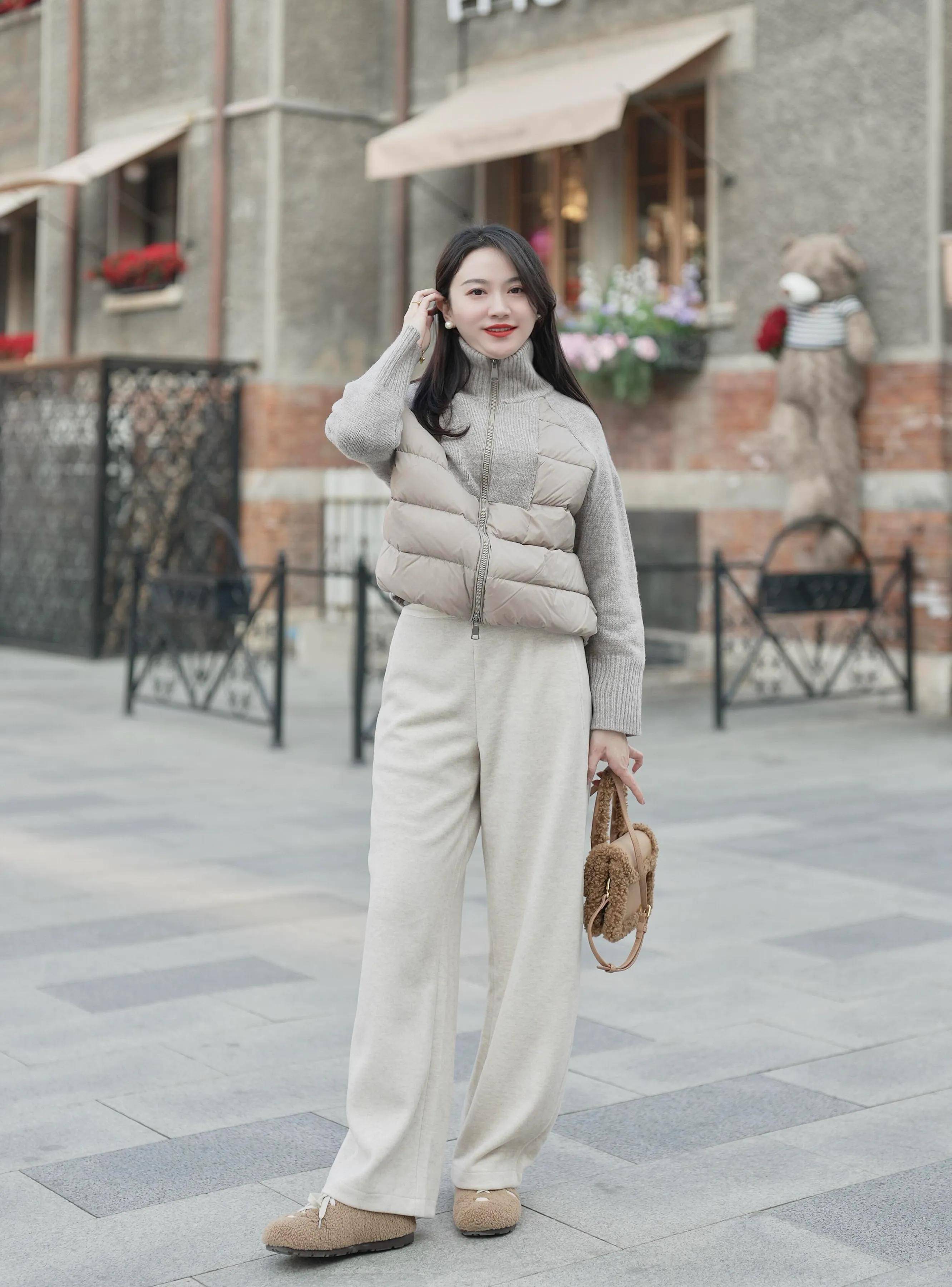毛绒边白色羽绒服+灰色针织毛衣+黑色阔腿裤:捧一杯热奶茶,温柔氛围感拉满,电影截图既视感。