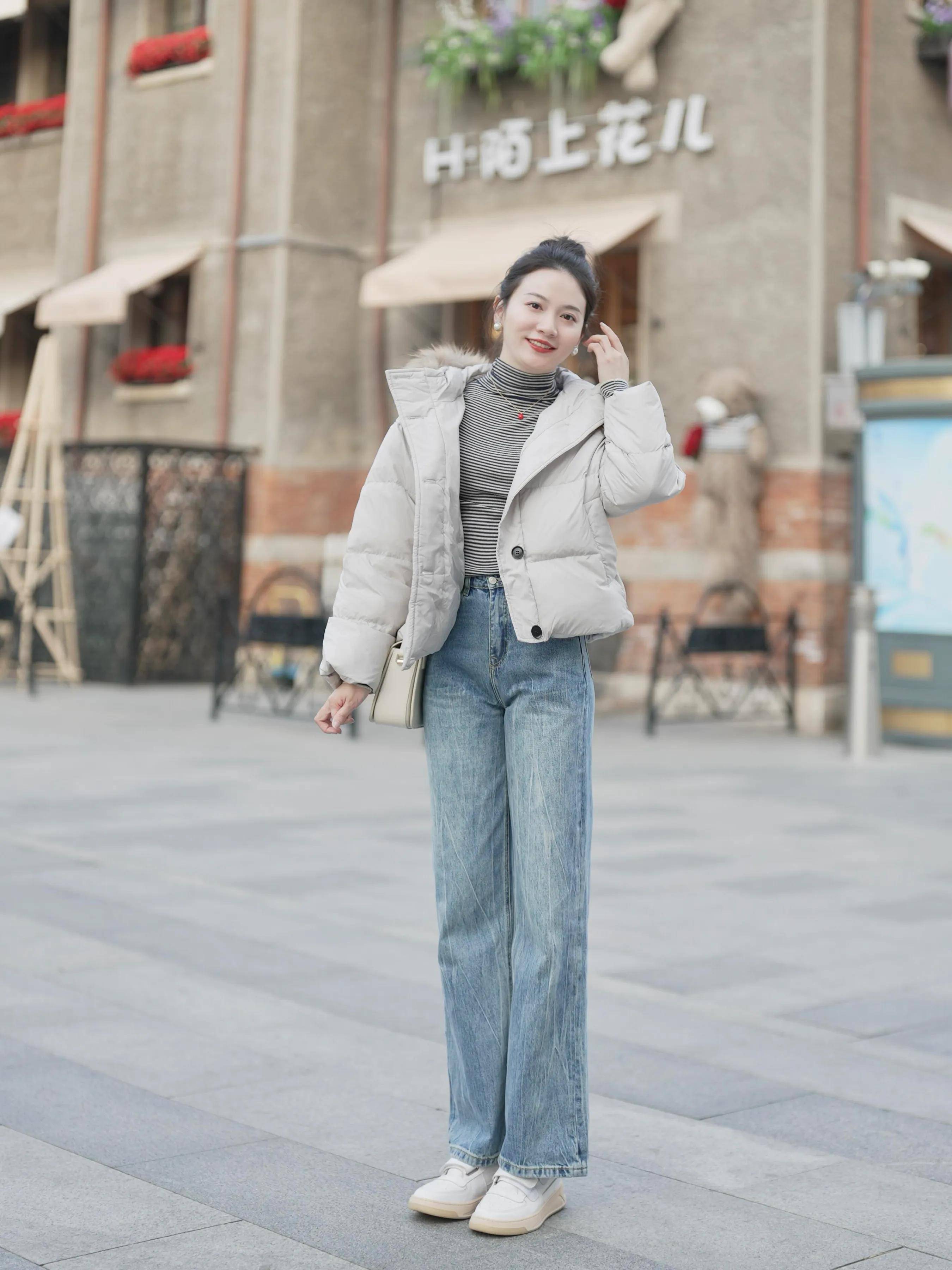 短款羽绒服利落干脆,搭配白色直筒长裤,视觉上瞬间拉长身形,完全不压个子。