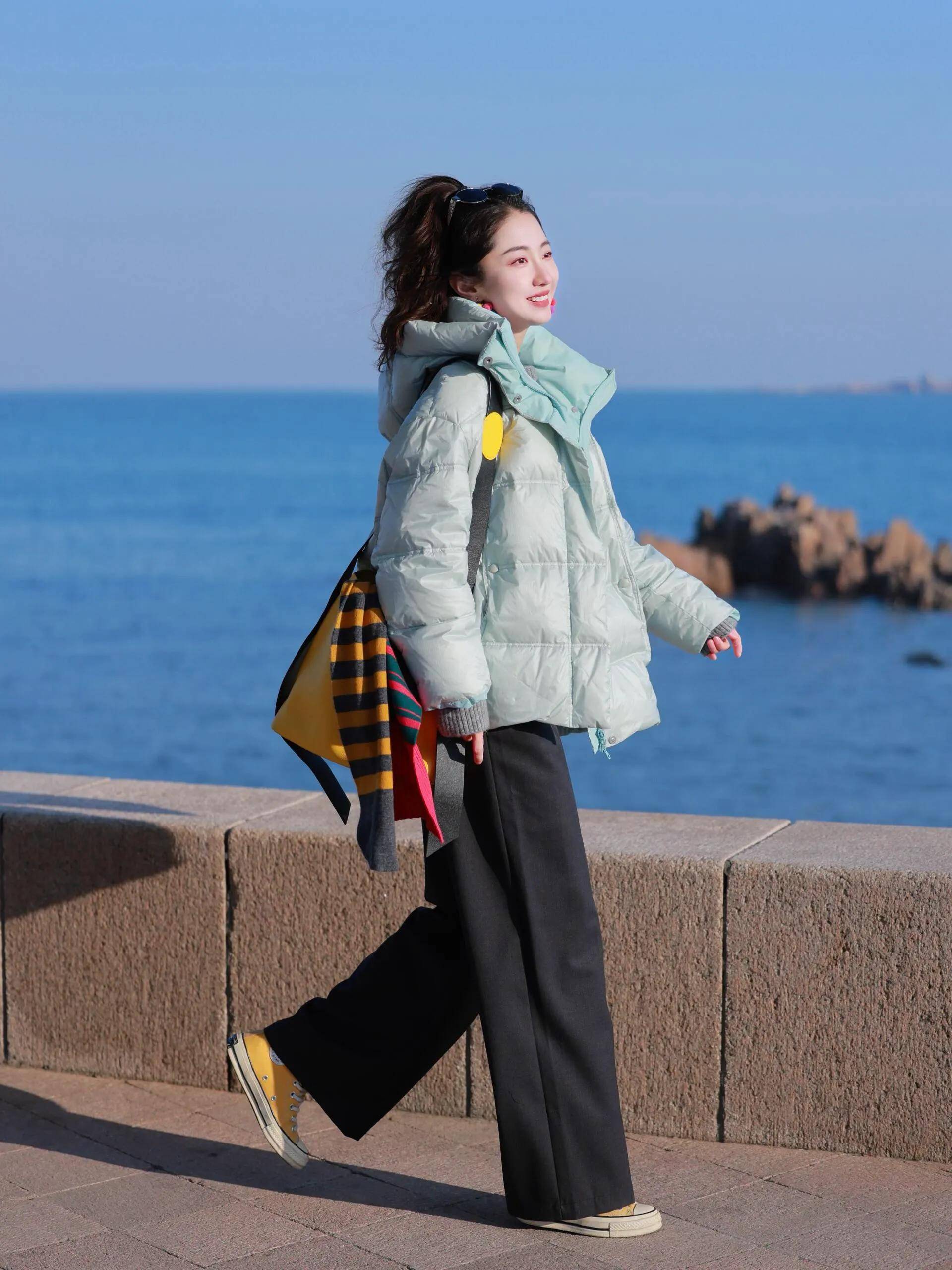 浅绿色羽绒服+灰色直筒裤+黄色帆布鞋:海边夕阳下明快色彩出片率极高,光影中充满诗意。