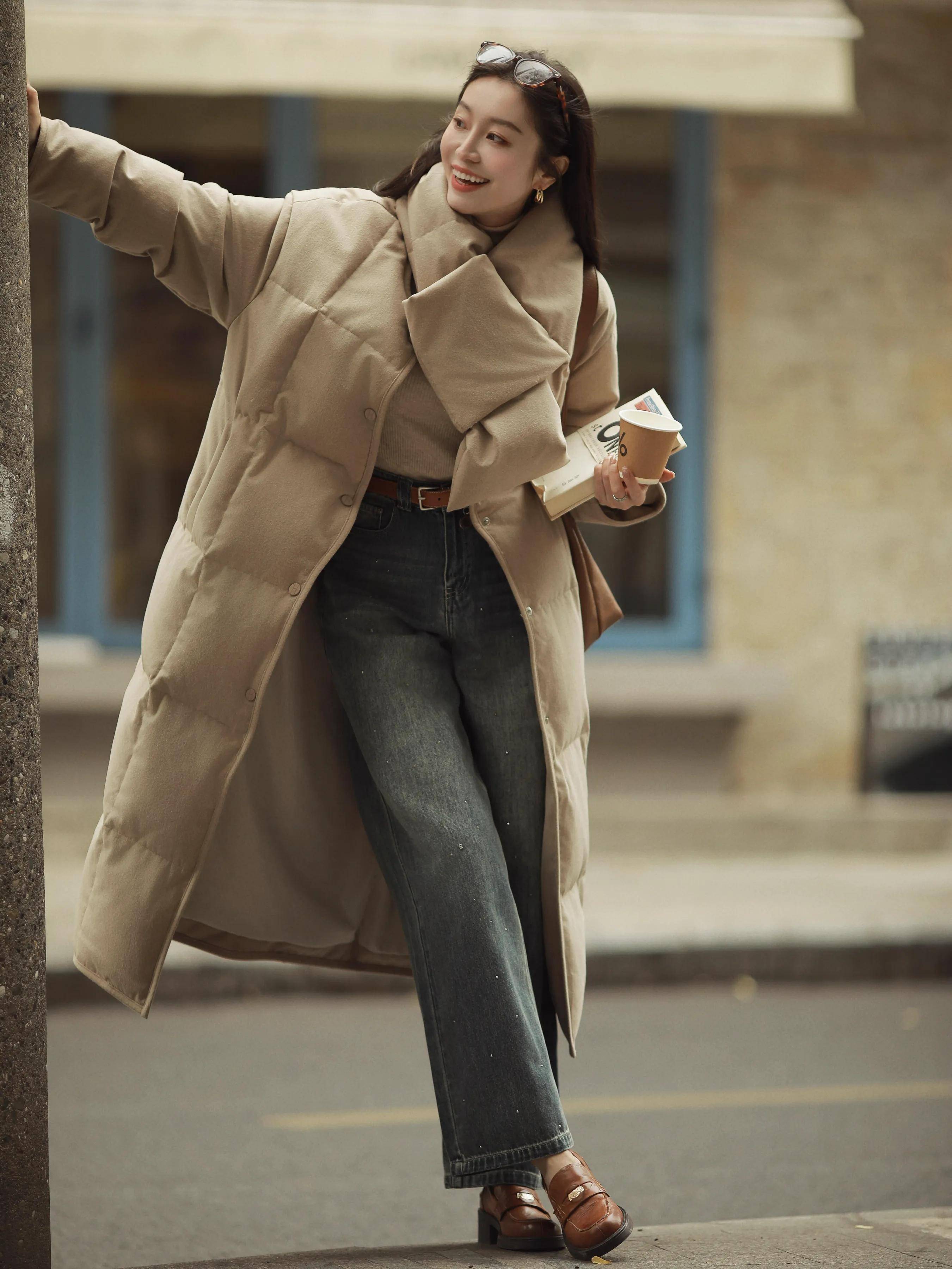 H型流畅:卡其色长款羽绒服搭配直筒裤,用利落线条隐藏身材短板,适合微胖或梨形身材。