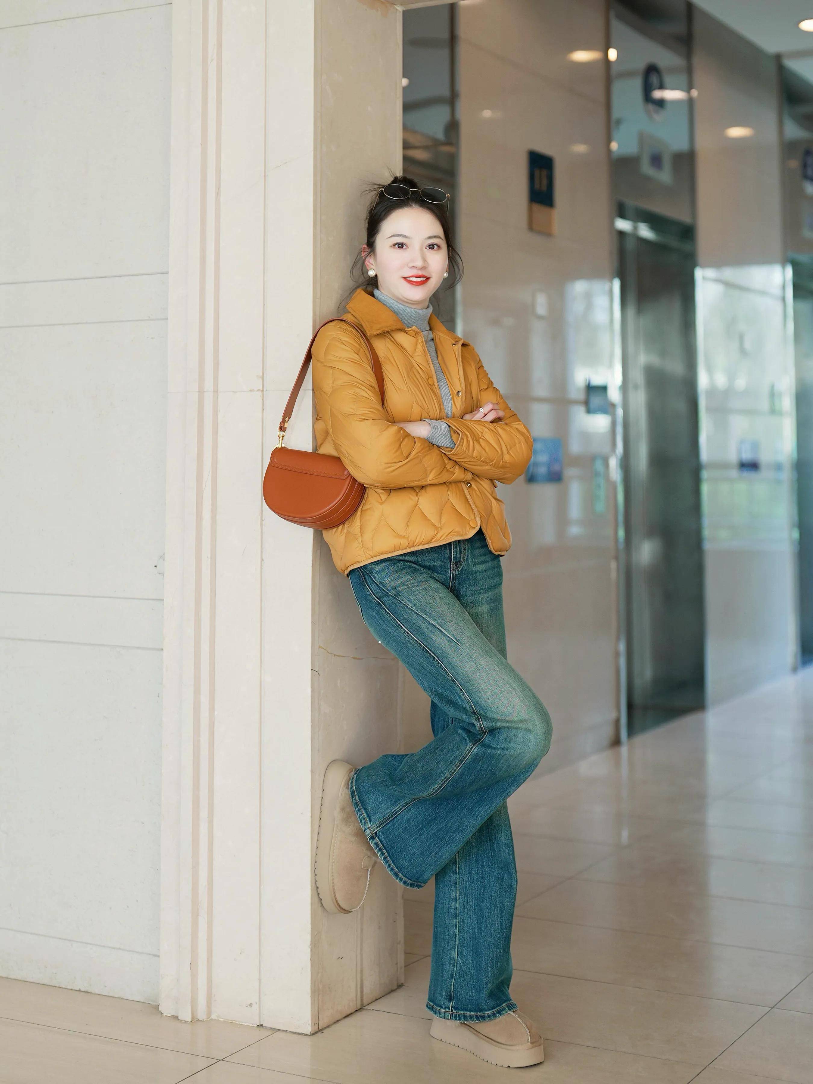 大地色棉服+灰毛衣+蓝色牛仔裤+驼色雪地靴:暖色调包裹提亮肤色,活力与温暖并存。