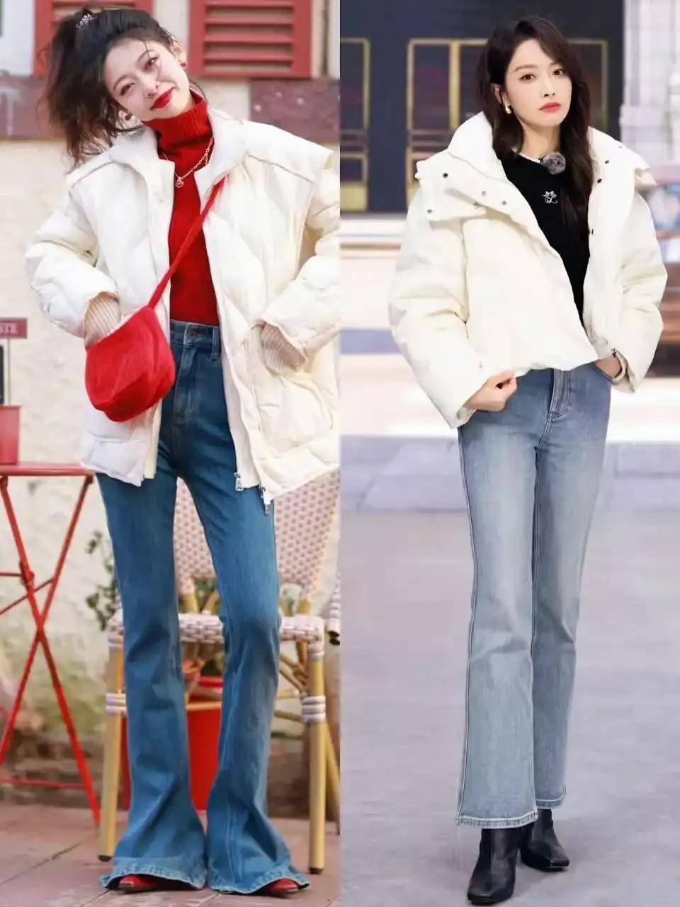 局部提亮:棕红色羽绒服+牛仔阔腿裤+红色单肩包,用配饰打破沉闷,时髦感飙升。