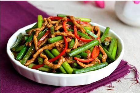 匹配点:图片中有绿色蒜苔、红色辣椒和肉丝,与菜谱中"蒜苔+肉丝+辣椒"的组合一致,符合常见烹饪搭配。