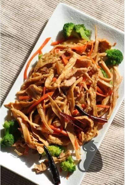 内容:豆腐皮丝、肉丝、红色辣椒丝、绿色蔬菜丝