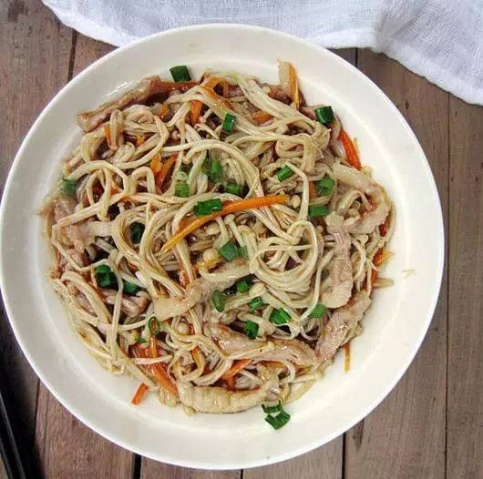 匹配点:图片中有肉丝、金针菇和胡萝卜丝,与菜谱中"肉丝+金针菇"的核心组合一致,胡萝卜丝为额外食材。