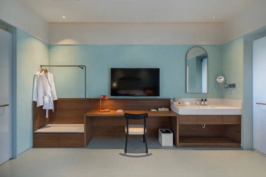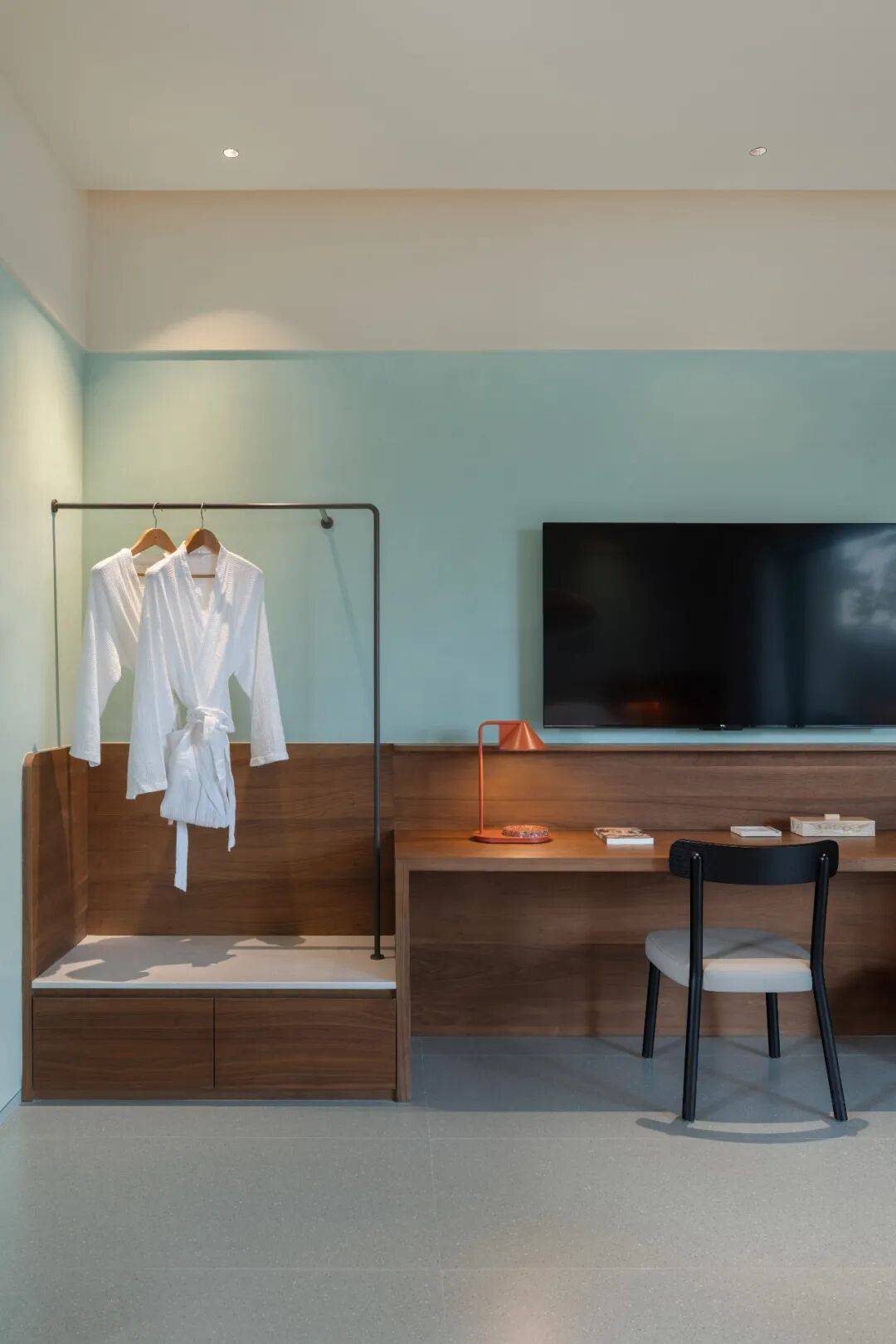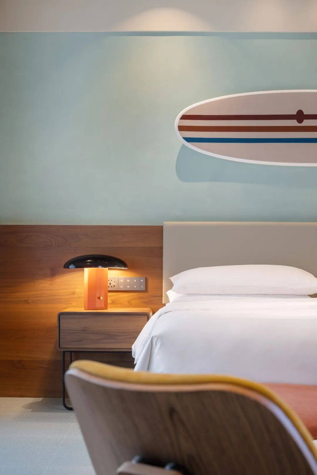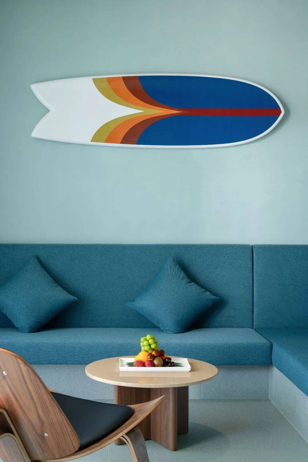 客房区分为两部分,3号楼设有冲浪主题大床房/双床房81间,2号楼设有冲浪主题庭院房18间及套房8间。客房均以蓝绿色调为基础,在一定高度设置分割线,上部米色下部蓝色,创造出丰富的空间层次。客人能接触到的区域选择胡桃木为主材,提升品质感的同时带来温润的触感,软装上也选择多巴胺色彩、并与冲浪文化相关的家具配饰进行点缀。