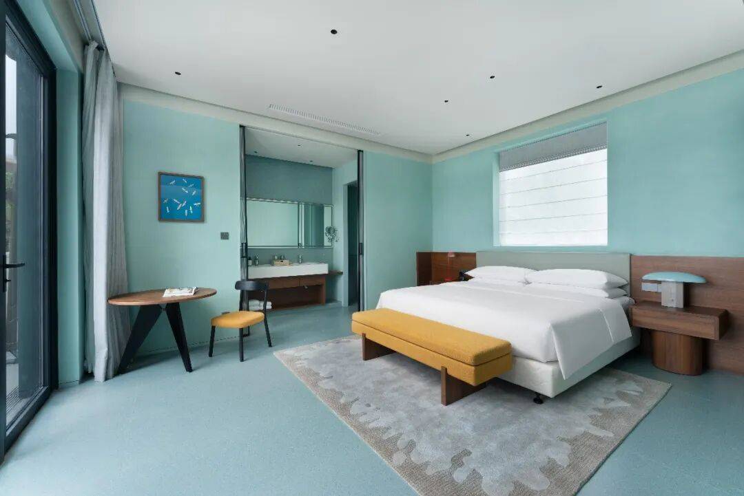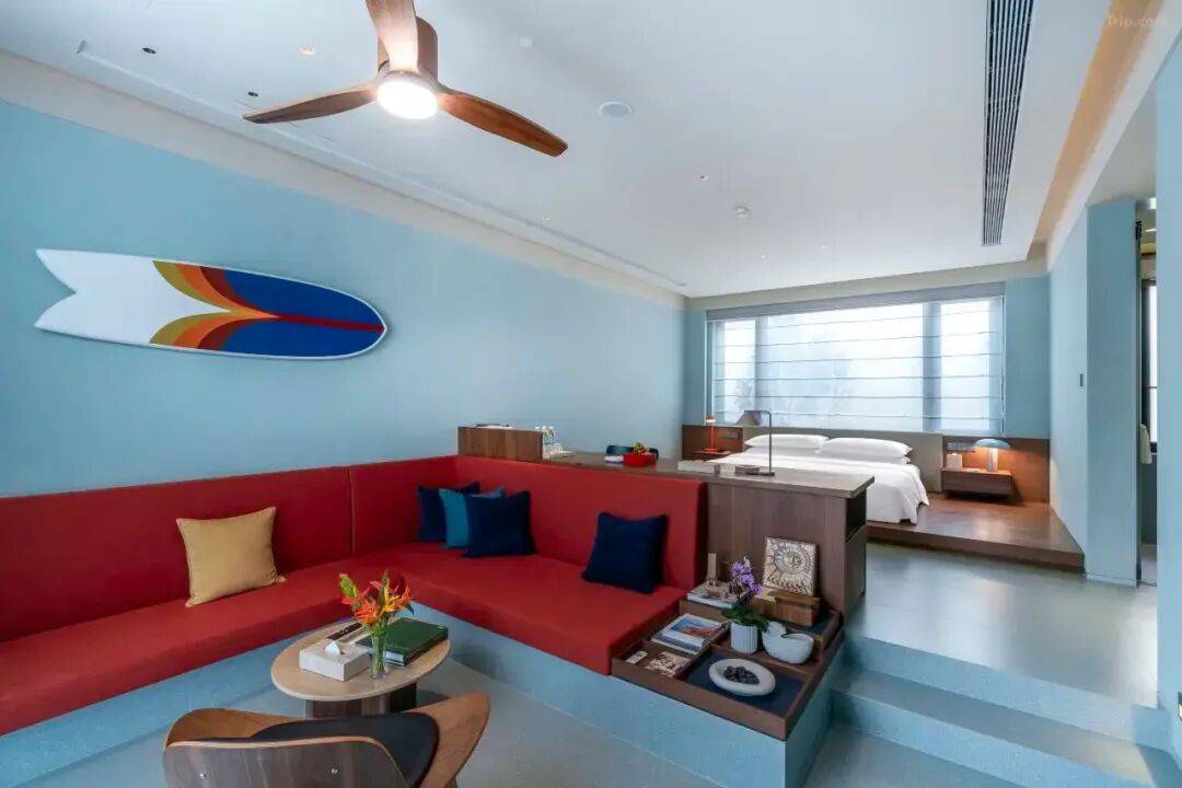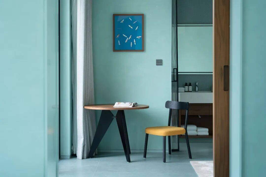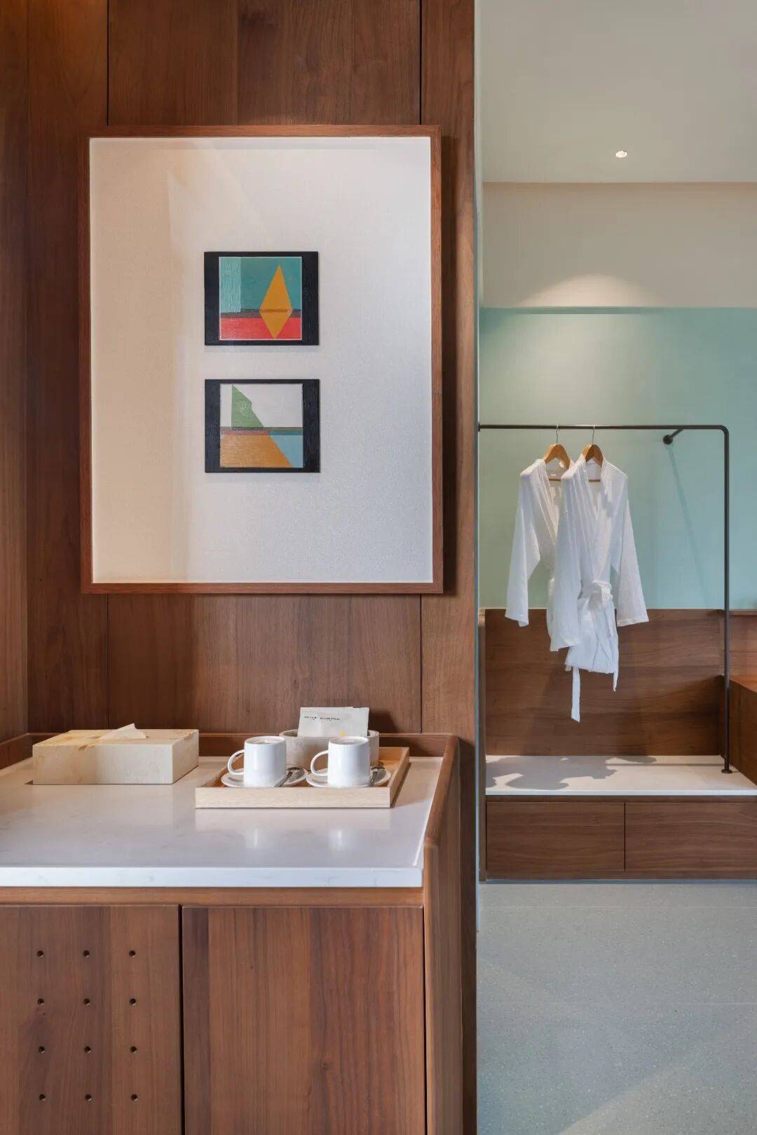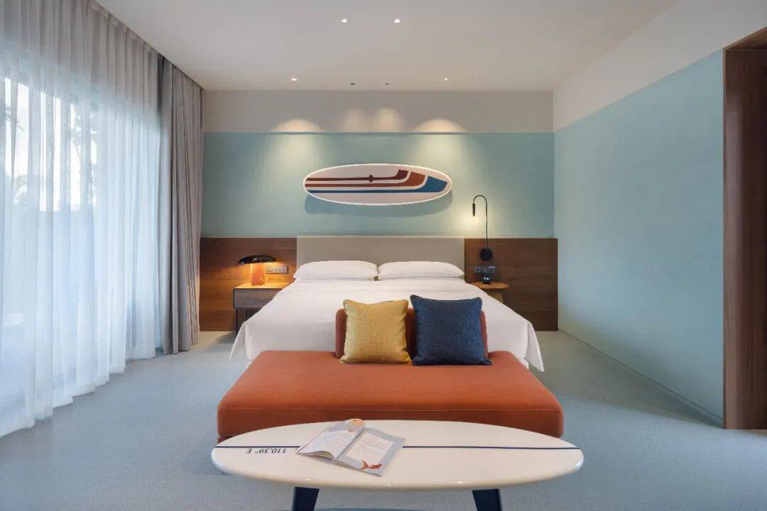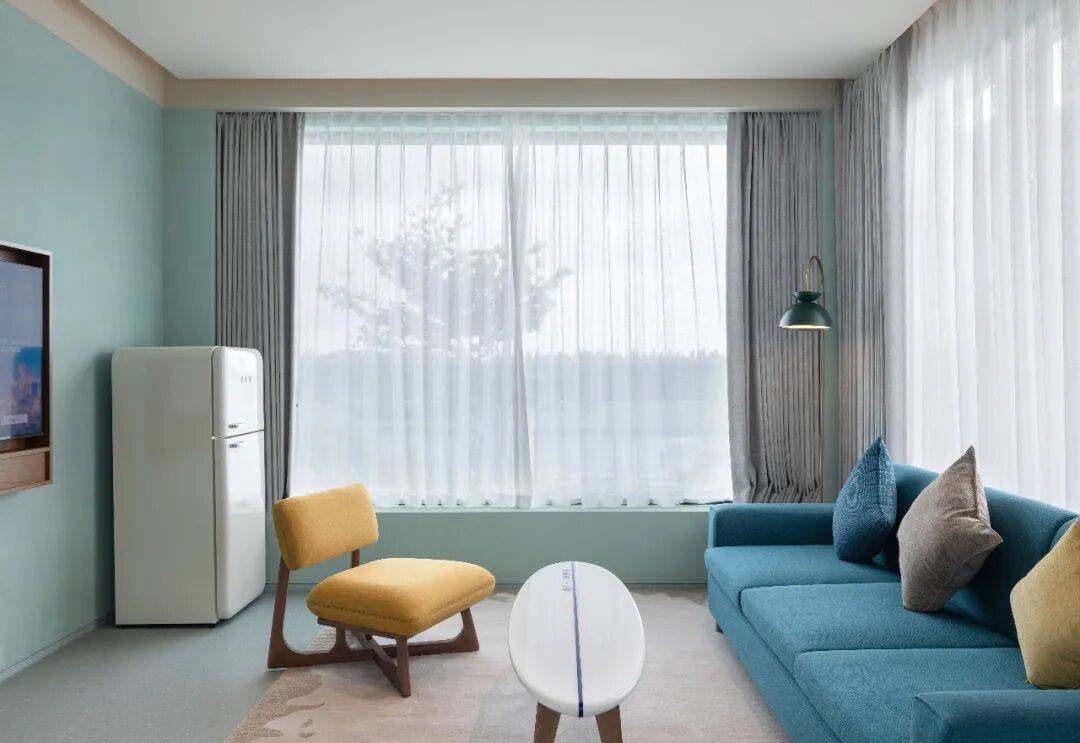客房区分为两部分,3号楼设有冲浪主题大床房/双床房81间,2号楼设有冲浪主题庭院房18间及套房8间。客房均以蓝绿色调为基础,在一定高度设置分割线,上部米色下部蓝色,创造出丰富的空间层次。客人能接触到的区域选择胡桃木为主材,提升品质感的同时带来温润的触感,软装上也选择多巴胺色彩、并与冲浪文化相关的家具配饰进行点缀。