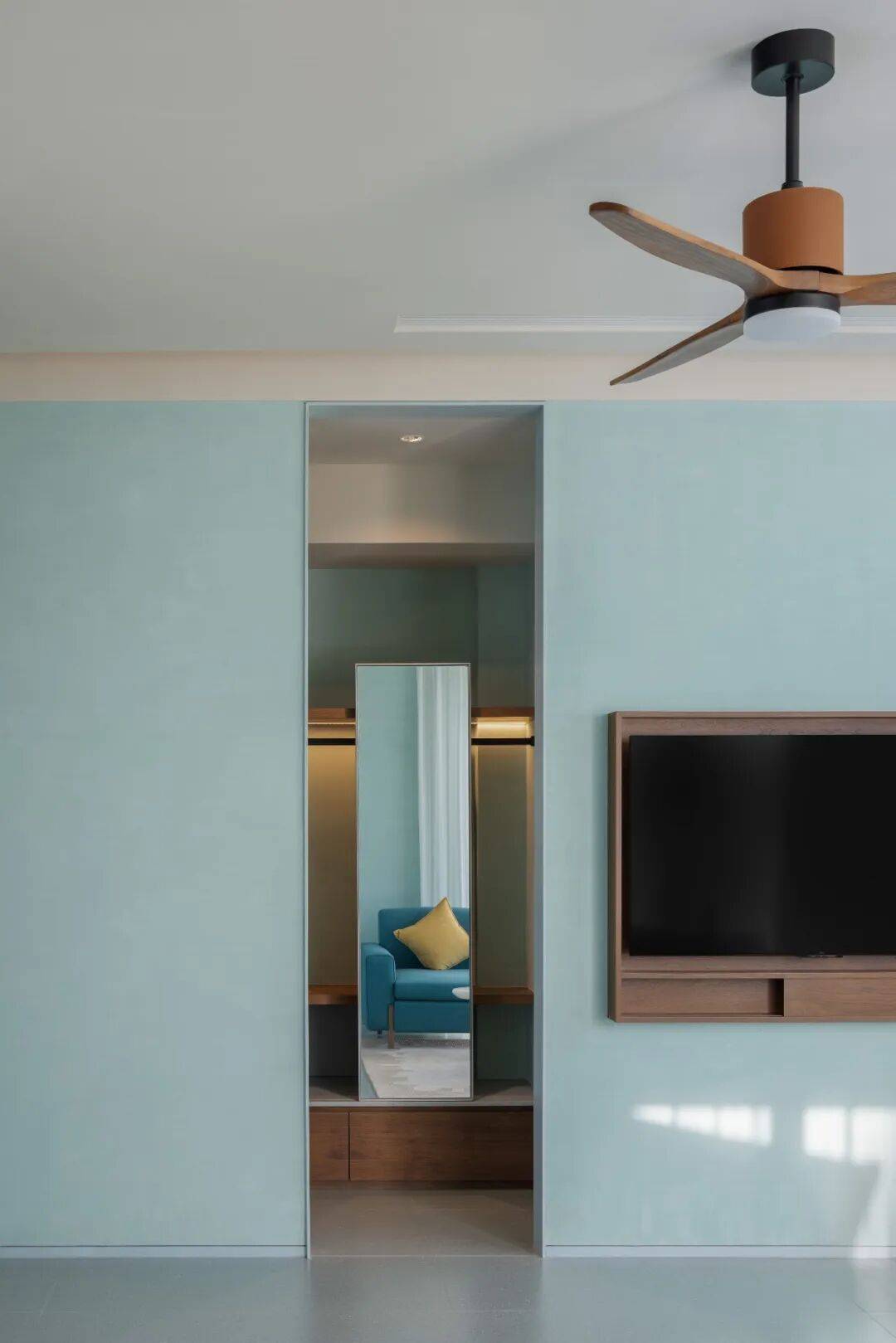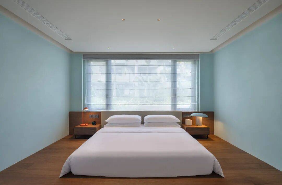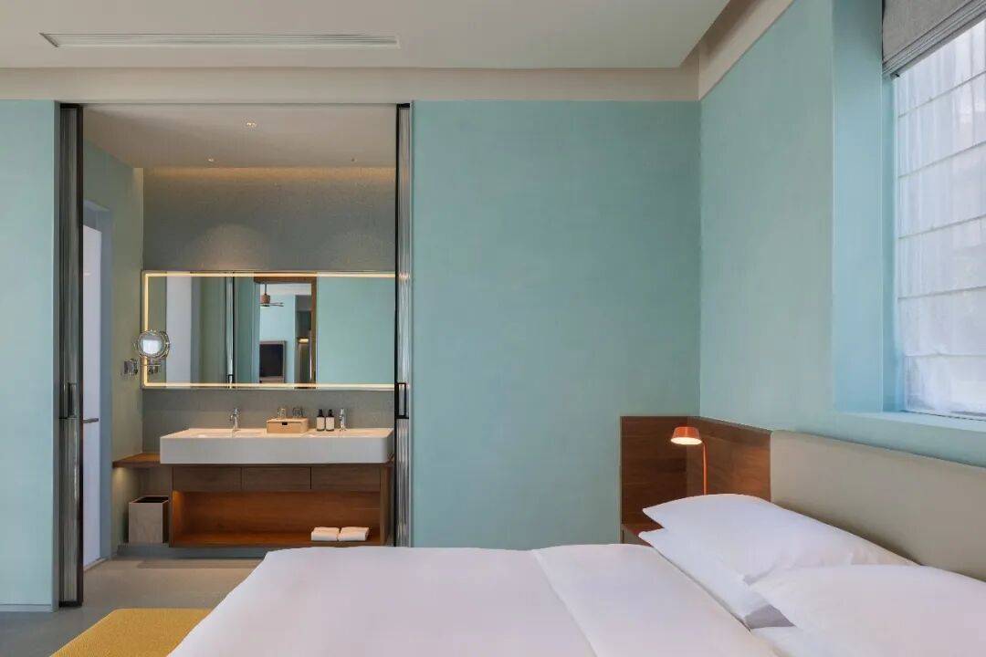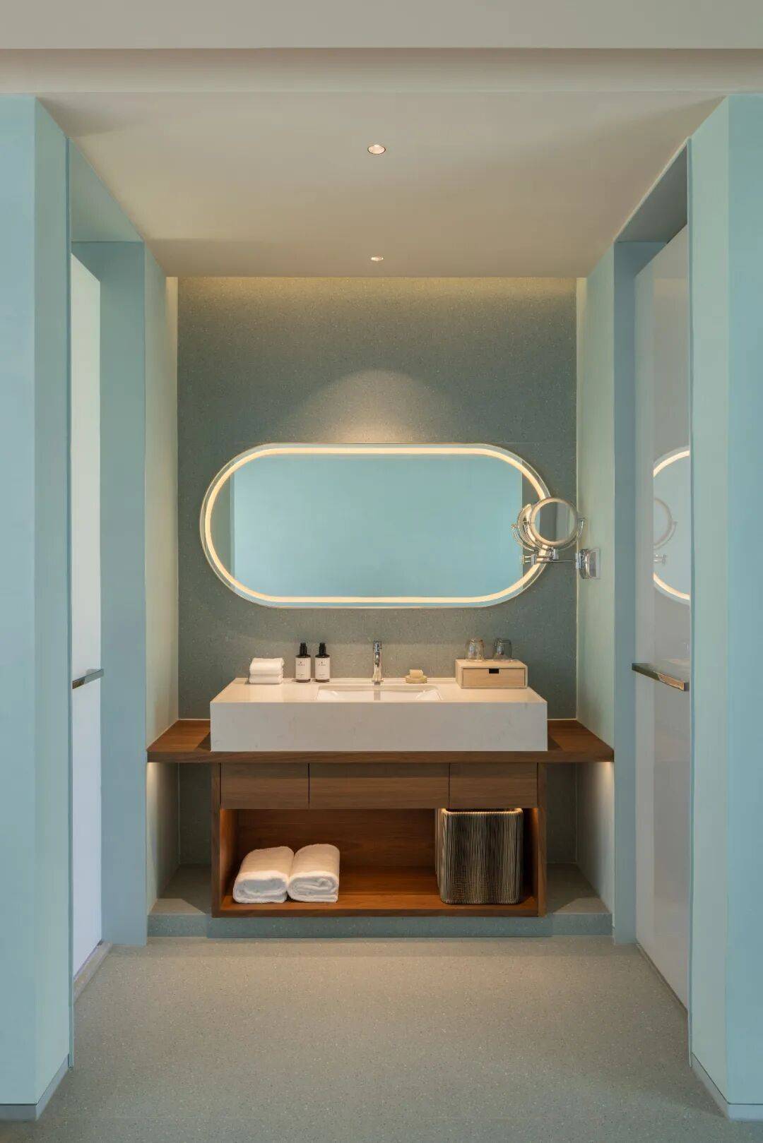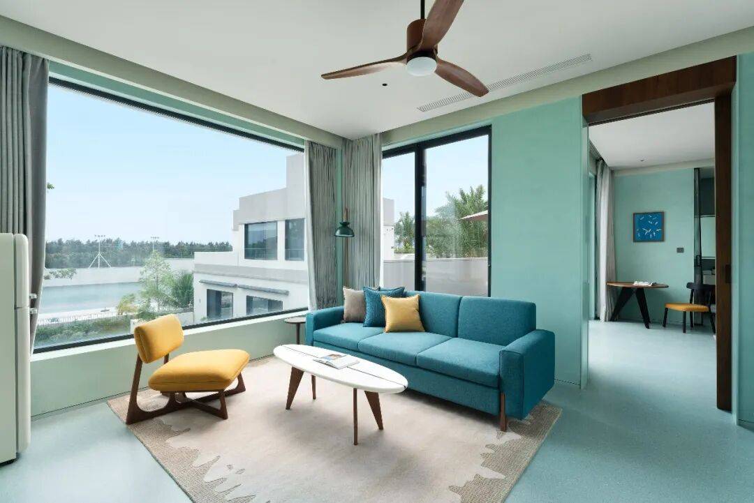 客房区分为两部分,3号楼设有冲浪主题大床房/双床房81间,2号楼设有冲浪主题庭院房18间及套房8间。客房均以蓝绿色调为基础,在一定高度设置分割线,上部米色下部蓝色,创造出丰富的空间层次。客人能接触到的区域选择胡桃木为主材,提升品质感的同时带来温润的触感,软装上也选择多巴胺色彩、并与冲浪文化相关的家具配饰进行点缀。
