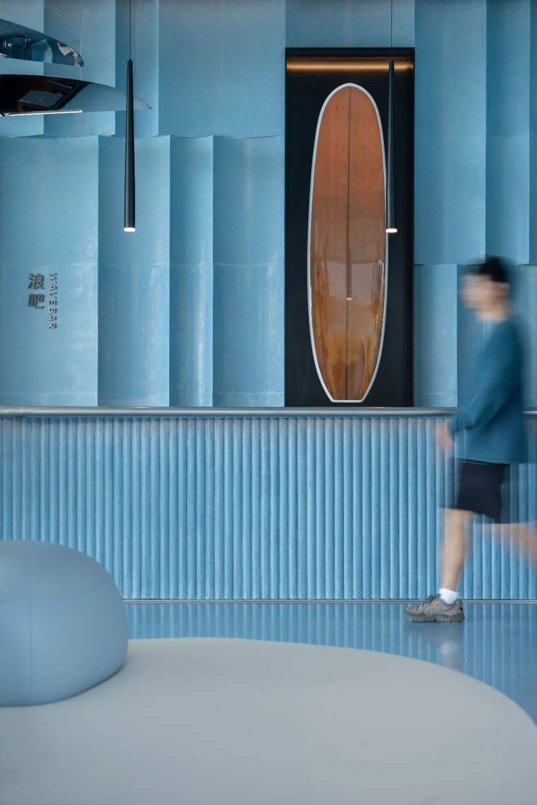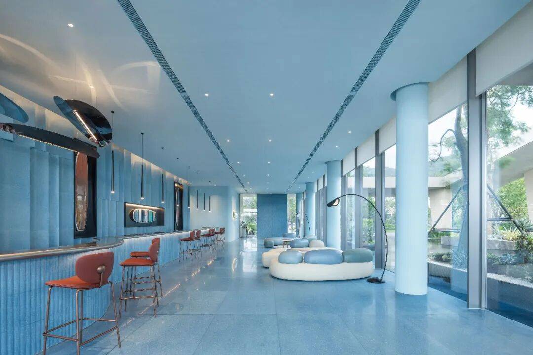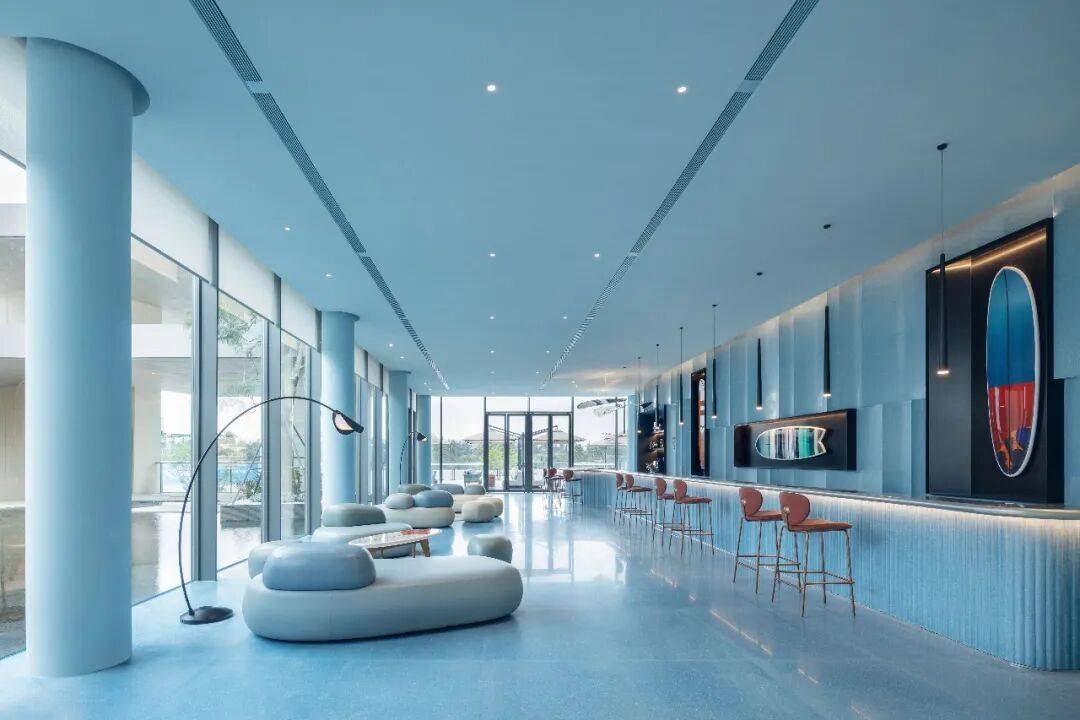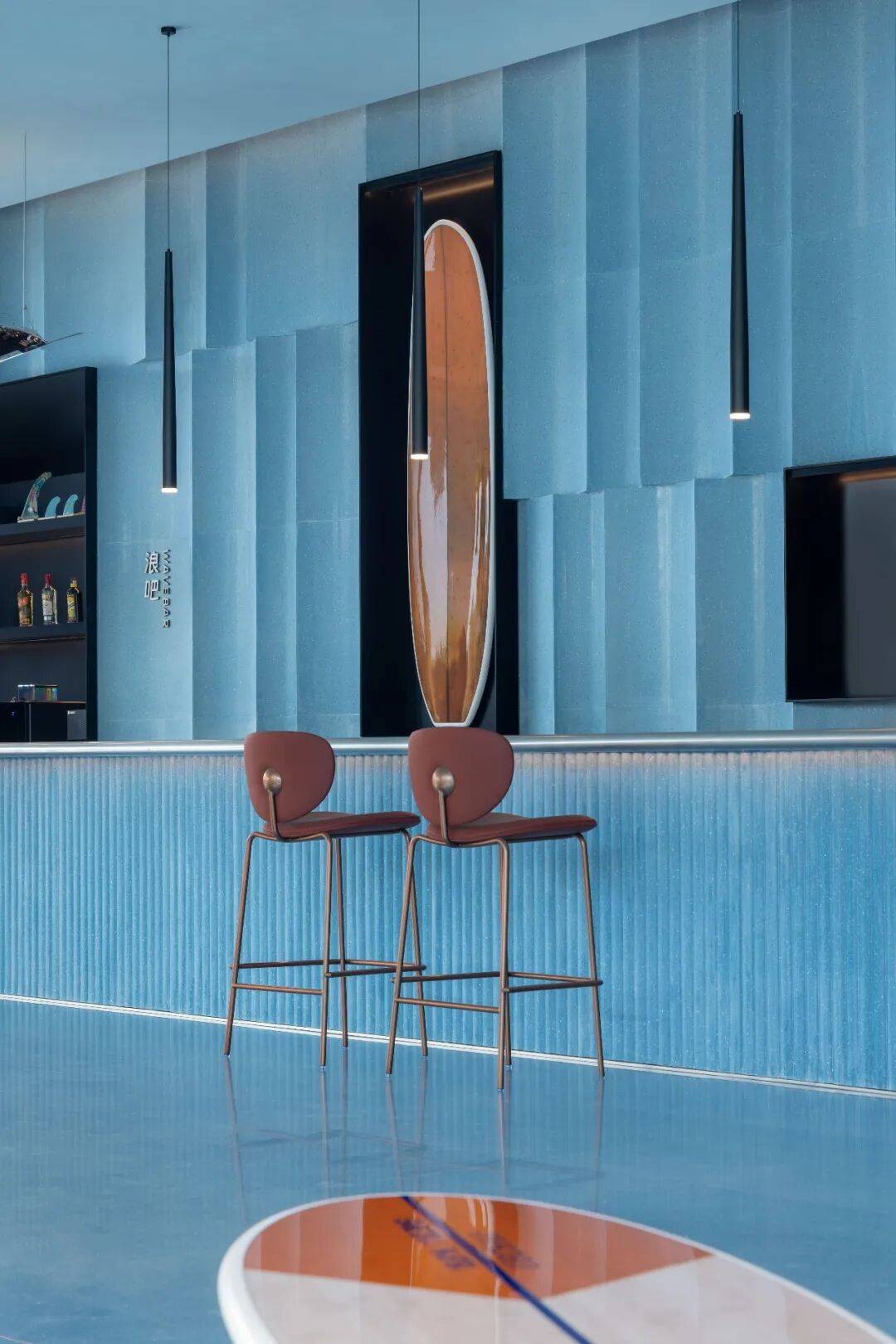 “浪”元素与蓝色空间:大堂抓取“浪”的元素,以多巴胺色系里的“蓝”为主色调,将水磨石切割为大小不同、或凹或凸的弧形,错落拼制成背景墙和吧台墙,具象地显现海浪。不同层次的蓝和不同体块的组合,形成具有张力的蓝色空间,临近却各有不同的纹理和触感。波动的曲线为大堂空间注入流动感,太阳东升西落,浪型之影随着光线的推移发生变换。