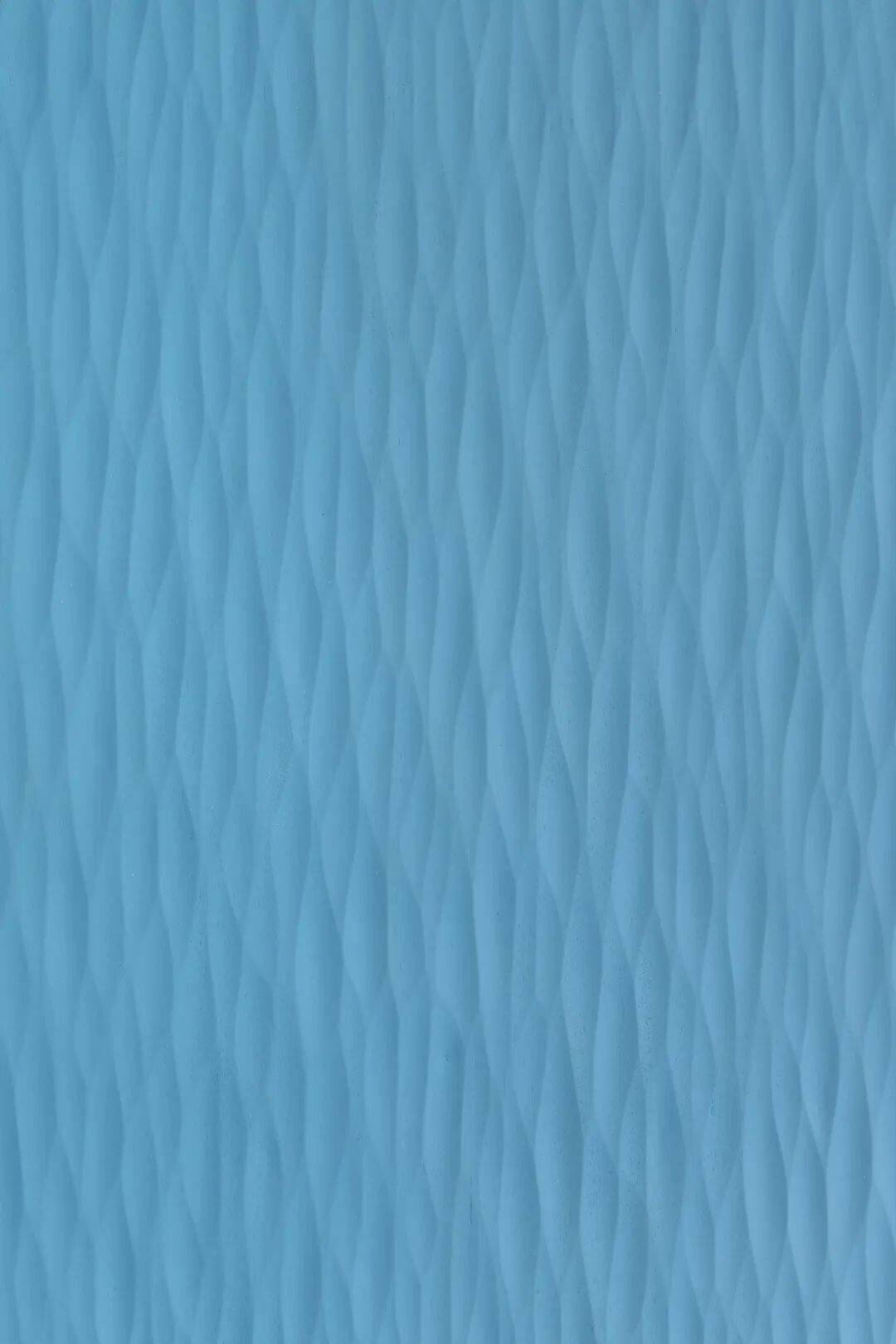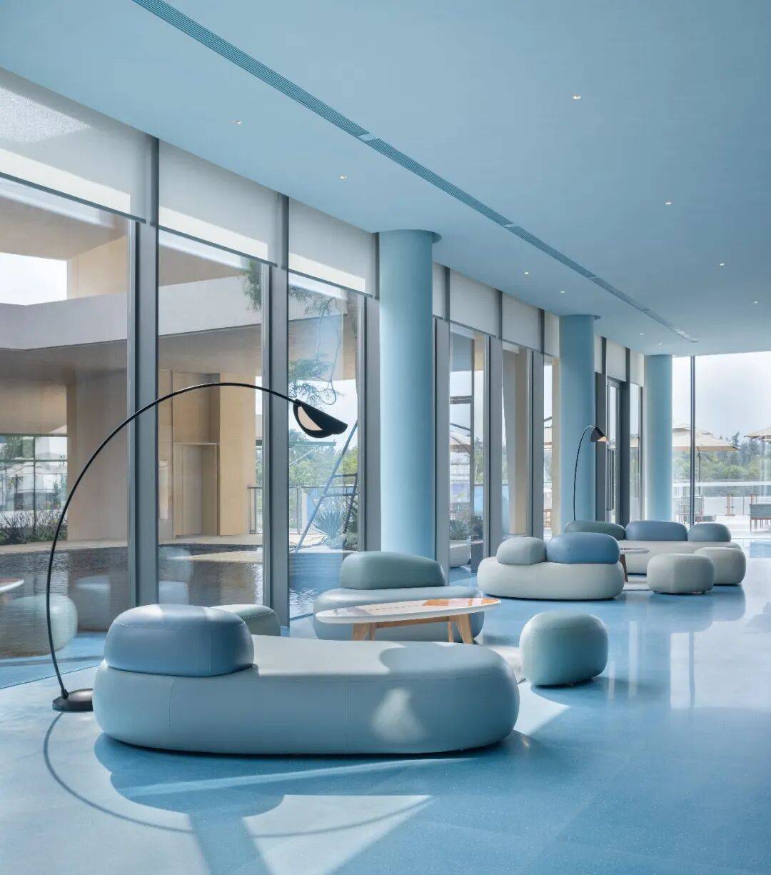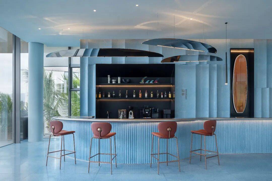 “浪”元素与蓝色空间:大堂抓取“浪”的元素,以多巴胺色系里的“蓝”为主色调,将水磨石切割为大小不同、或凹或凸的弧形,错落拼制成背景墙和吧台墙,具象地显现海浪。不同层次的蓝和不同体块的组合,形成具有张力的蓝色空间,临近却各有不同的纹理和触感。波动的曲线为大堂空间注入流动感,太阳东升西落,浪型之影随着光线的推移发生变换。