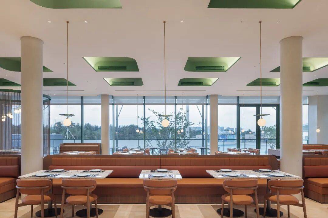 美食餐厅“恰 Char”以浅绿色调为基础,自助吧台使用中性且温和的绿色点缀,成为空间中的视觉焦点,引导客人到吧台进行自助就餐。用餐区使用胡桃木和皮质组合,结合窗边充足的自然光线,营造出轻松、舒适的用餐氛围。
