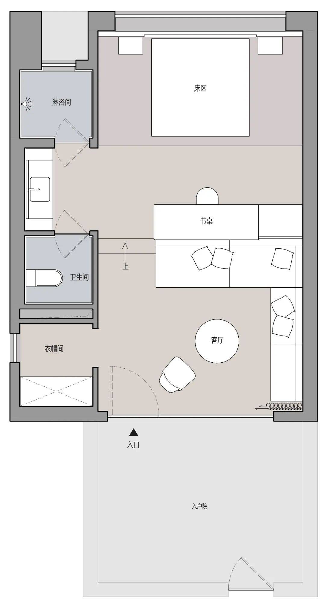 52平方米的庭院房:位于2号楼1层,采取递进式空间布局。经由庭院入户后首先到达会客区,L型的卡座沙发组合便于各类社交活动的发生。起居空间通过台阶和书桌进行划分,半高的书桌可以给后卧室区域带来一定私密性,视线也可以跳过书桌聚焦至末端的取景窗。书桌后方布置榻榻米式卧室区域,材质的转化和高度的变化清晰地划分着空间。