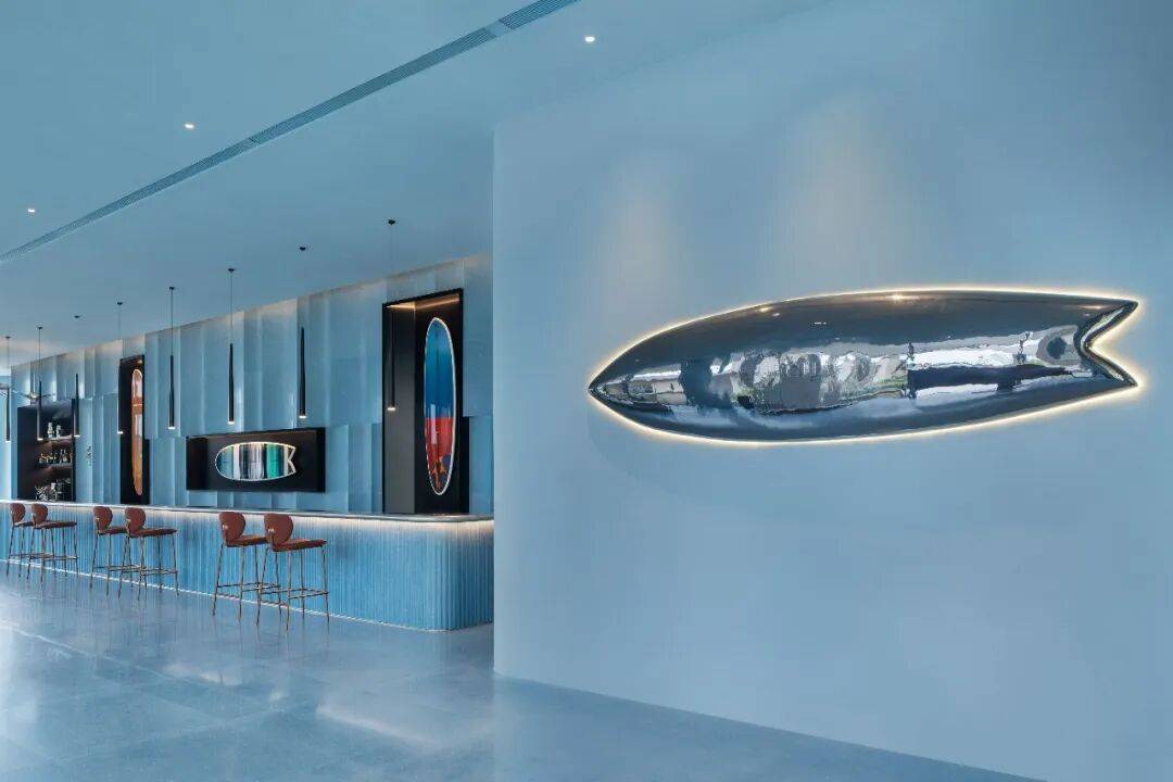 开放式布局:大堂空间呈开放式布局,兼顾接待、咖啡、酒吧等多项功能。客人到达后能自然而然地切换成松弛模式,入口墙面上用镜面不锈钢模拟冲浪板,也似一条鱼的外形,直接点明冲浪主题。