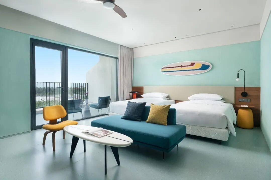 多巴胺被认为是“快乐分子”,是人类大脑中的一种神经递质。酒店结合日月湾的冒险荷尔蒙基因,以多巴胺色彩为切入点进行设计。从酒店房间到整体环境,多巴胺色彩随处可见,打造出社交型、微度假的年轻冲浪主题酒店,兼具品质和轻松自由的氛围。
