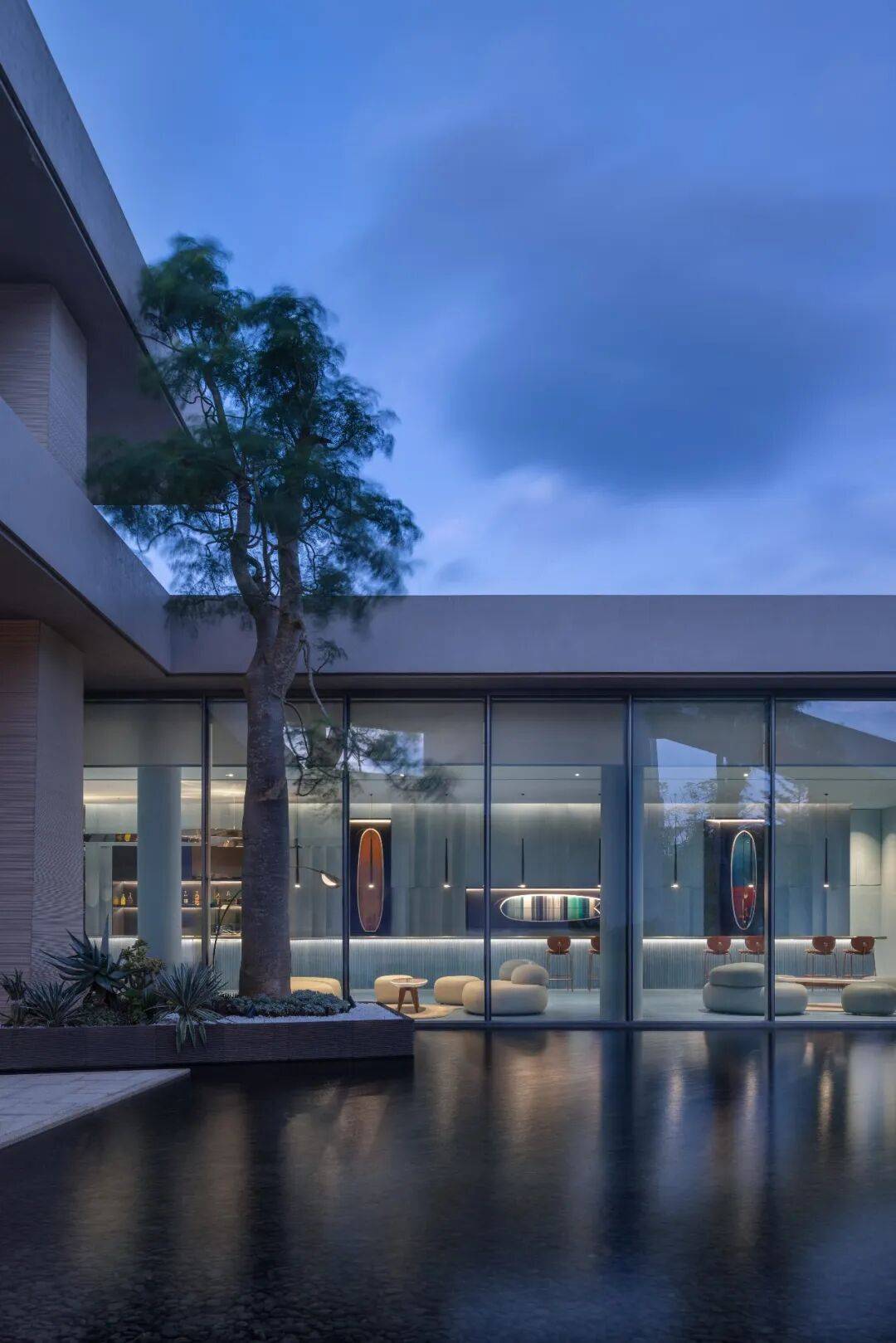 功能分区与动线设计:顺着动线往内,右侧靠墙设置吧台,左侧沿玻璃幕墙布置家具作为休息区,落地玻璃使庭院景观渗透室内,充满生机。设计中将前台接待功能与咖啡吧、酒吧串联为一体,步入大堂,视觉顺着吧台的纵深感向露台外泻湖方向延伸。至吧台末端造型微微隆起,示意功能转变,顺应隆起的弧形摆放高脚凳,形成咖啡区与酒吧区,供客人驻足停留。