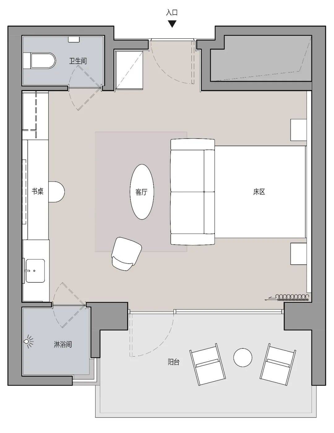 45平方米的标准房:位于3号楼的1至5层。针对有限的房型面积,设计中尽量减少空间分割,仅对卫生间与淋浴间做单独分区以确保干湿分离。衣帽架、书桌、洗漱台集合到同一桌面且做开放式处理,将更多面积留给起居室和客厅区域,消除小面积带来的闭塞感,同时沙发区的布置也能兼容更多的社交活动。