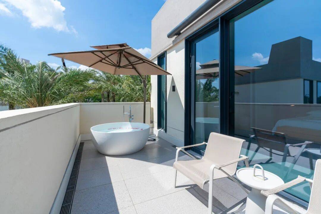 72平方米的庭院套房:位于2号楼2层。独立的起居空间和会客空间通过隐藏式移门串联,可在独立和开放中自由切换。双露台的配置各司其职,前露台丰富入户过程的体验,后露台提供室外休憩和室外浴缸的复合功能。