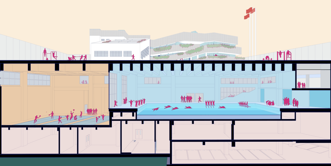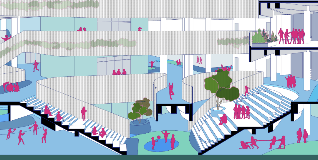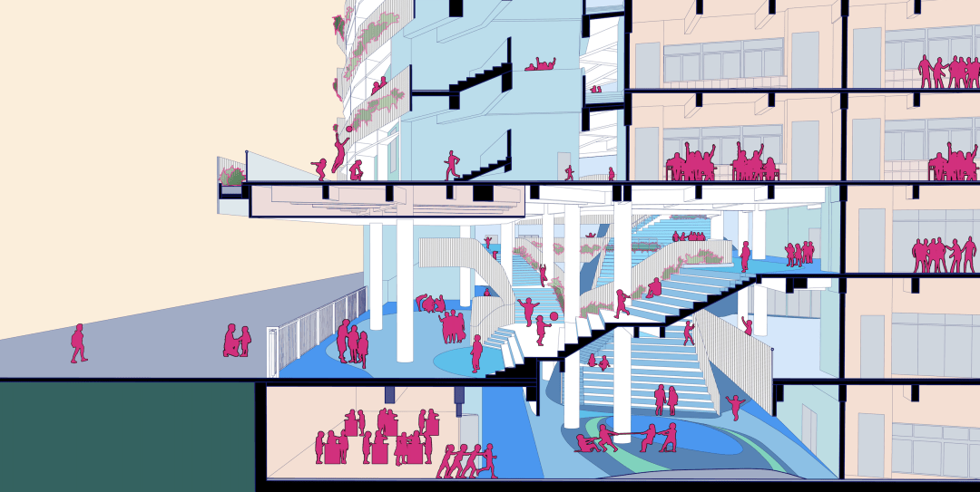 包括绿色屋顶、图书馆和体育设施在内的退台空间将不同楼层连接起来,增强了视觉和空间上的连续性。学生在校园中活动时,能够感受到空间的流畅性和整体性,提升对校园环境的认同感和归属感。