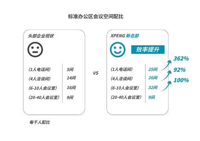 仅仅从AI和新能源汽车产业发展的角度考虑,不难想象其内部职场环境一定会追求高度的活力、弹性和效率。建筑师在设计之初走访了大量头部企业,对办公平面进行比较计算,提出了单人办公面积、会议室类型比例、每千人会议空间和每千人卫生间配比等的提升建议,数据与设计规范或行业惯例相较均有不同提升。