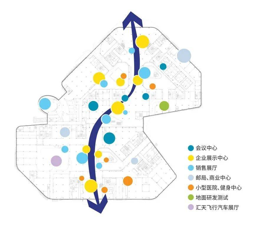 由此向南延伸,贯穿整个主楼的,是一条类似城市主干道的“大动脉”,是建筑内的南北交通主轴。沿这条宽阔的主动脉两侧依次布局会议中心、企业展示中心、销售展厅、地面研发测试、汇天飞行汽车展厅、健身中心、邮局乃至小型医院等各种公共功能,各功能的落位均根据人流强度、私密级别和物流便利程度等因素确定。