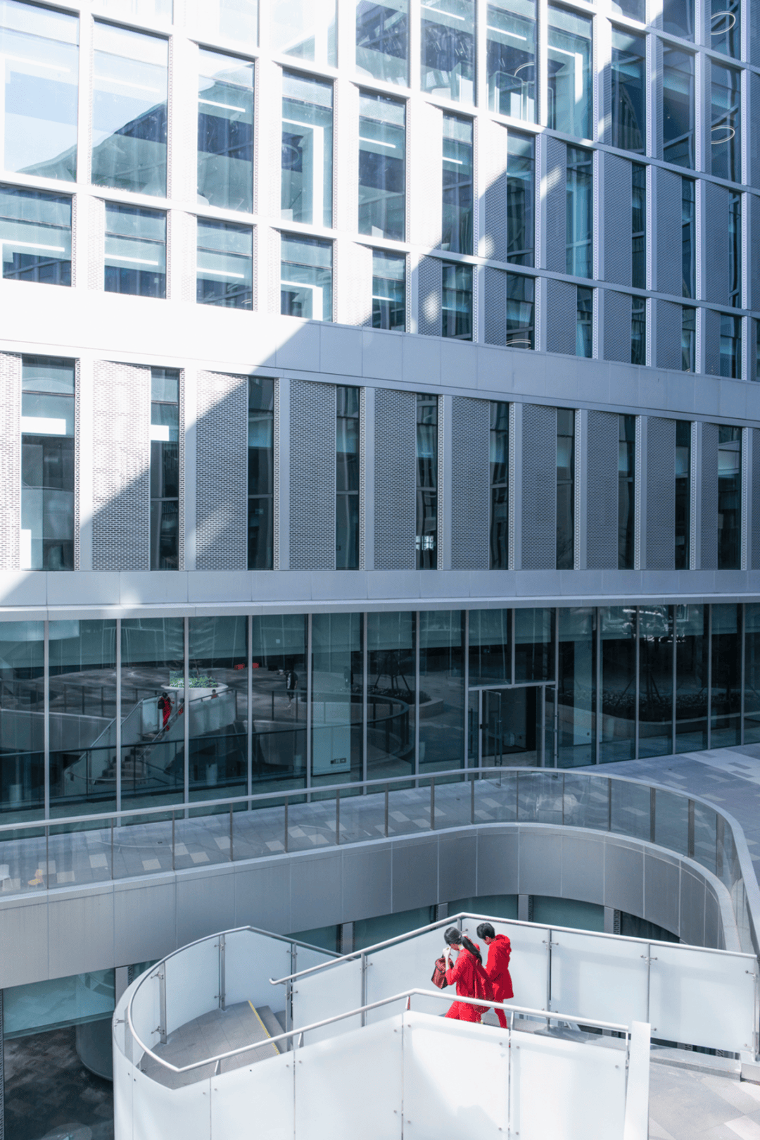 内庭院立面则根据日照分析做了渐变的网格式设计,设置通风器以避免开窗带来的秩序紊乱。沿街的透明轻盈减轻了巨大体量的压迫感,符合科技新势力企业的气质;内庭的立面严谨浪漫,传递头部企业的安定信任感。