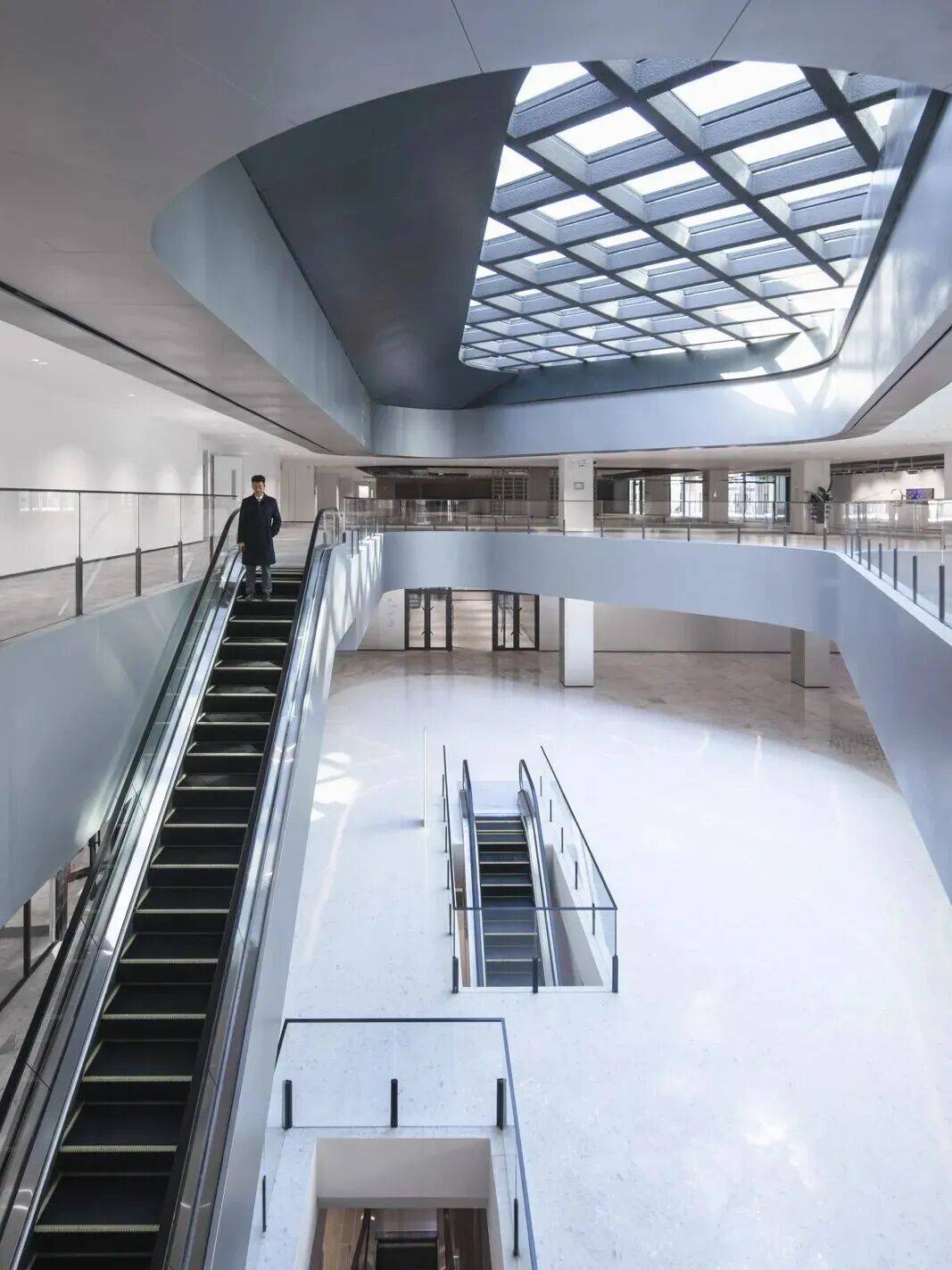 交通革新:地下4层车库支持双层自动泊车,楼内三级流线设计(垂直交通节点+机械履带通道)提升效率,员工可快速通勤至各功能区。