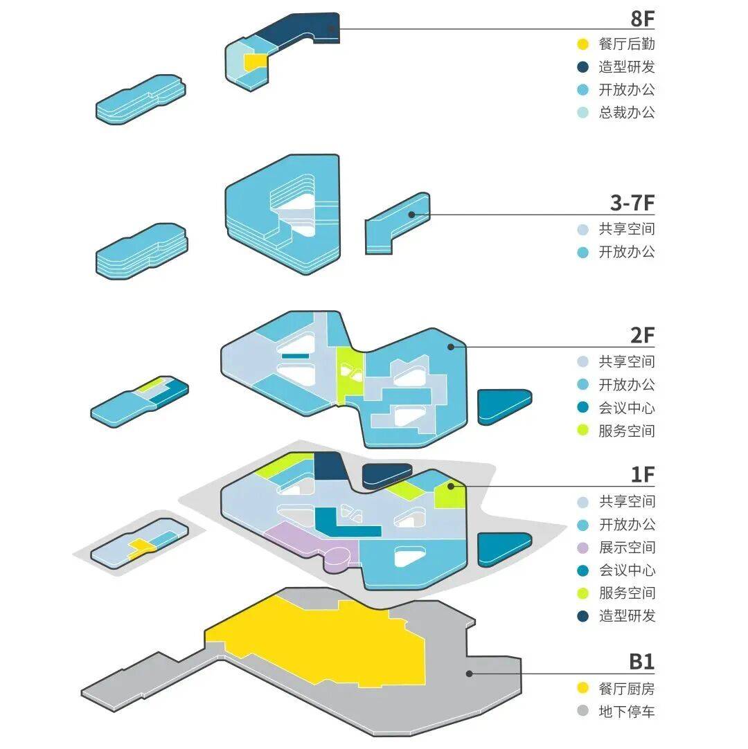 庞大的地下空间是为解决车企总部大量自用车、试验车的停放需求。另外,B1层也提供了用餐面积达2万平米的巨大餐厅。地上部分以研发办公为主;其中底部基座提供企业服务、研发测试及满足楼内上万名员工生活、工作的各种服务功能,同时承担大量的外部交流、会议和展示功能,完全可与一个小型城市社区媲美。