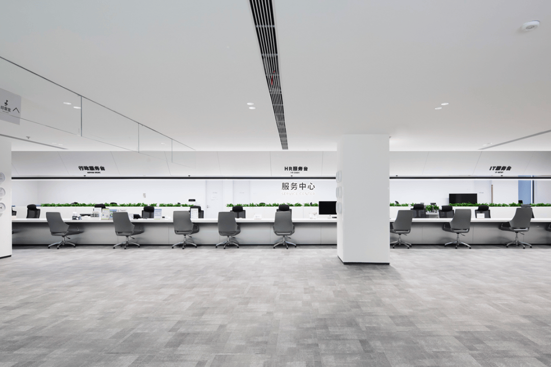 主楼(T2)的基座承载了总部园区主要的社会化与内部服务功能,员工和外部访客都能在这里各取所需。与城市社区概念类似,基座二层设置了一站式服务中心,集中人事、后勤、行政、财务等窗口,入职、报销等全流程服务都可以在这里完成。