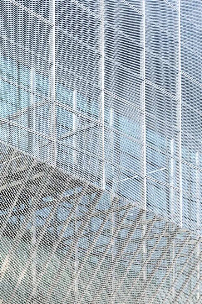 裙楼服务空间的立面可以更为灵活。建筑师以简化的小鹏Logo为基础设计了金属网面肌理,用它包裹裙楼部分。大面积的金属网在让出入口和采光面之后,呈现出和整体建筑相称的流畅造型,给了建筑群一个更加统一稳定的基座。