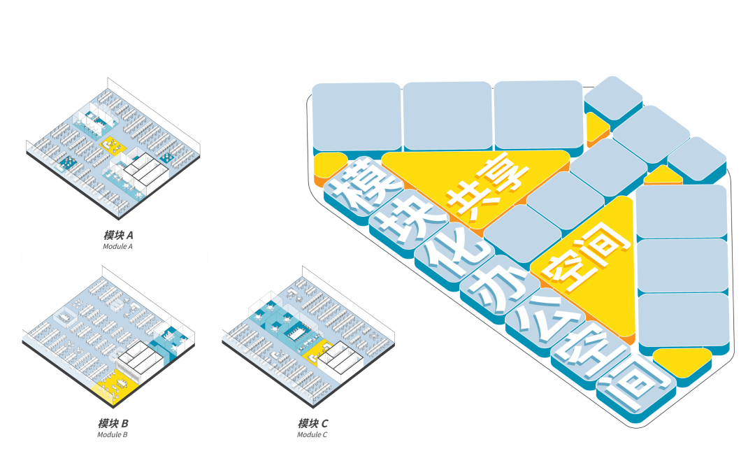 基于此,建筑师在职场部分采用了“大疏大密”的模块化原则。每个标准模块结合需求对应一种主题场所,再根据空间落位和部门使用诉求细化模块内的功能组合。