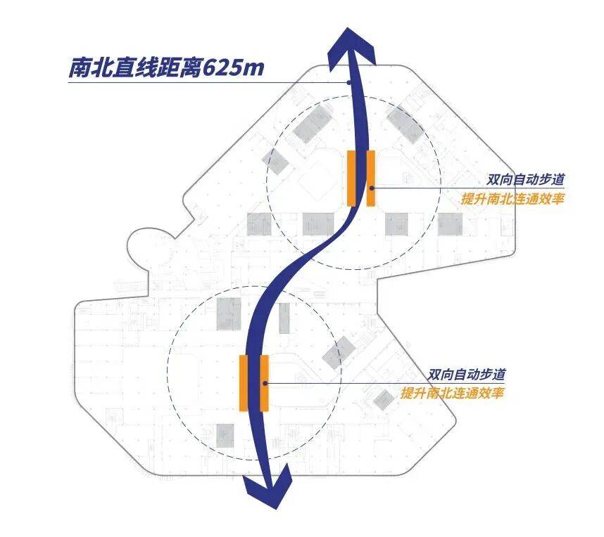 在此基础上,为最大化企业内部运转效率,我们在轴线两侧布置了四处自动步道,把单纯走廊部分的通过时间缩减了2/3。在办公空间内非常规地插入自动步道,使得整个空间氛围犹如大型航站楼,这也是一个地空双向出行企业的发展精神暗喻。