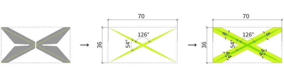 再以西侧的销售展厅为例,“X”形式被巧妙地折叠覆盖在圆形展厅上,形成兼做入口的立体形象昭示。