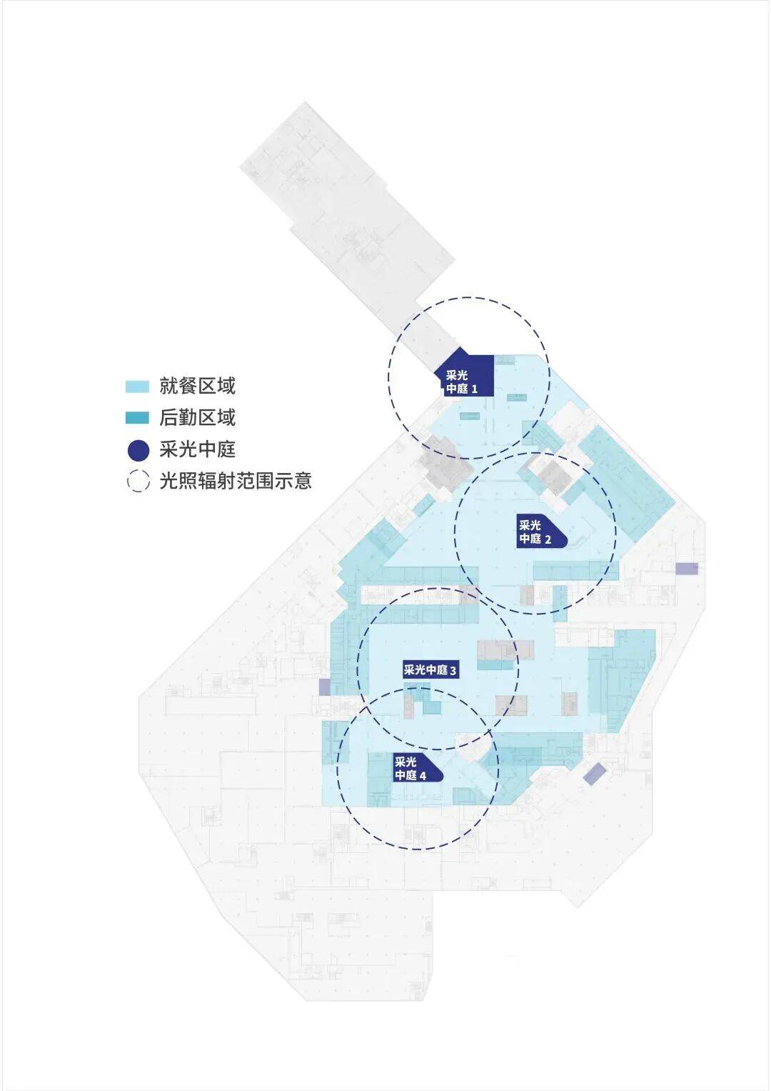 为了避免庞大地下场所黑暗、压抑的空间感受,我们增加了四处直通室外的阳光庭院,用餐区围绕四个中庭布置,保障就餐中的人们随时能够沐浴阳光、感受清风拂面。餐线围绕用餐区,两者交错布置,一方面减小座席和档口距离,另一方面也便于区分不同风味区域。