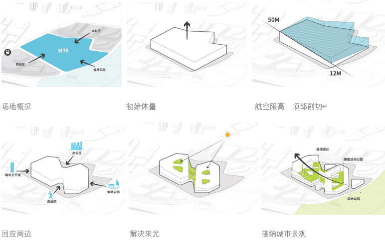该项目主楼部分高度由南向北迅速升起,造型动感强烈。这一造型的诞生并不单纯是建筑师的主观表达:场地南侧数公里内有一个专业直升机机场,用地位于航线下方。这导致南侧建筑限高12米,北侧限高50米。我们将场地红线内退,形成造型边界,满铺升起体量后,用航空限高削切顶部,就得到了一个面向东南的巨大斜面造型。这一针对“阻力”的直接动作,酷似汽车设计中的风阻优化路径。