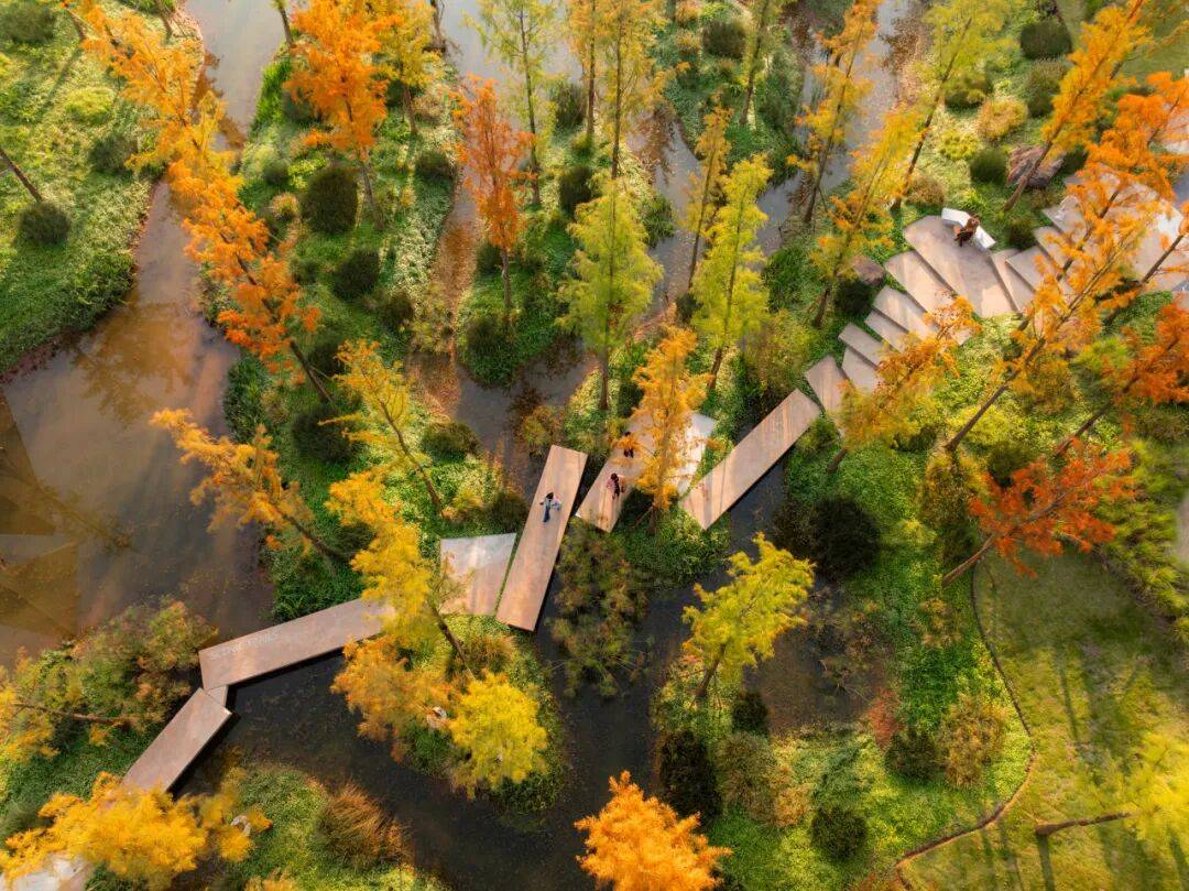 水面之上,是水杉映波的诗意景致;水面之下,藏着多重生态考量,配合水环境流速分析、行洪通道规划、岛链布局、竖向标高精准控制等一系列专项设计,构建起“行洪通道+静水湿地”的复合水生态系统。林被成为空间的主导者,线上线下采用差异化的材料与植物体系,既保障了防洪安全,又形成了丰富的生态分层,让场地具备抵御百年洪水的韧性。