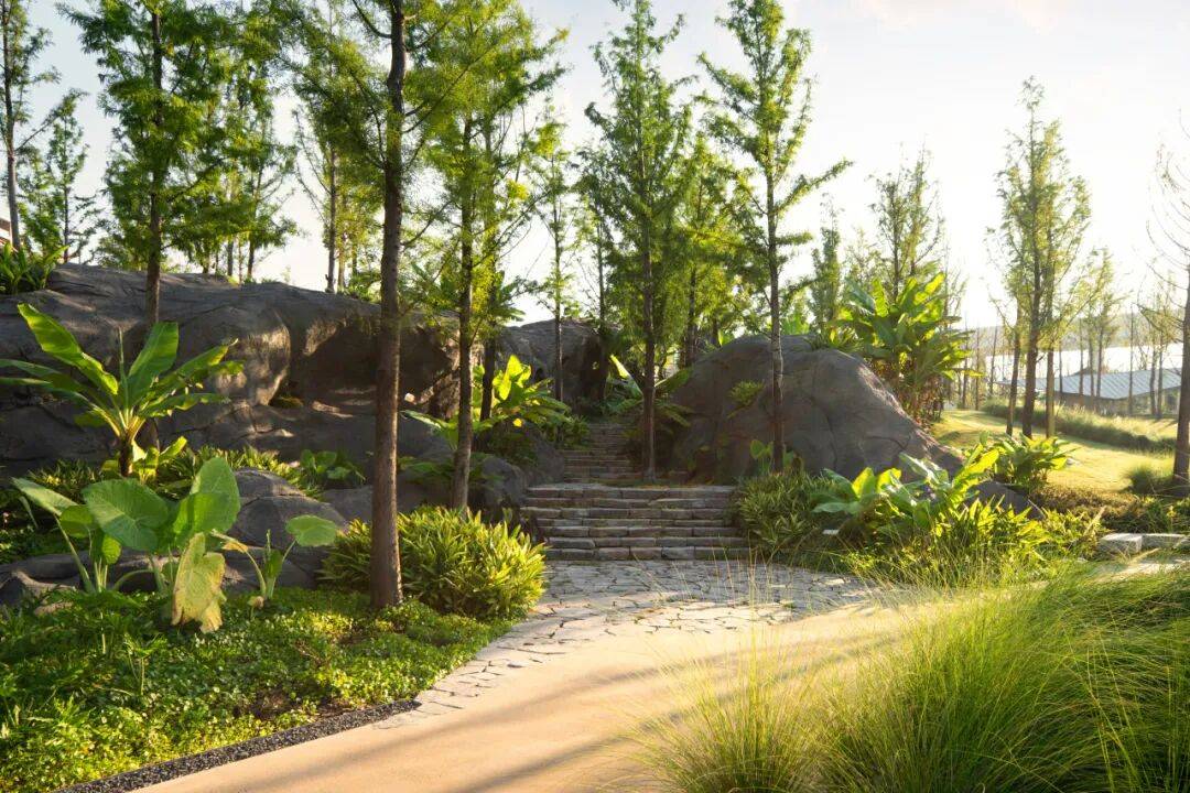 第二步,是场地记忆的延续,让大地肌理重新发声。设计团队从原生元素中挖掘设计语言——保留场地固有的绿坡植被、裸露岩石与石滩壶穴,将这些自然印记转化为景观的有机组成部分,重新绘制大地的肌理。在峡谷密林间,我们营造出“初极狭,才通人。复行数十步,豁然开朗”的空间体验,蜿蜒的路径串联起不同高差的场景,在保留场地原有高差关系的基础上,通过植物配置与地形微塑,进一步强化了重庆山地的空间特色,让每一次穿行都成为与场地记忆的对话。