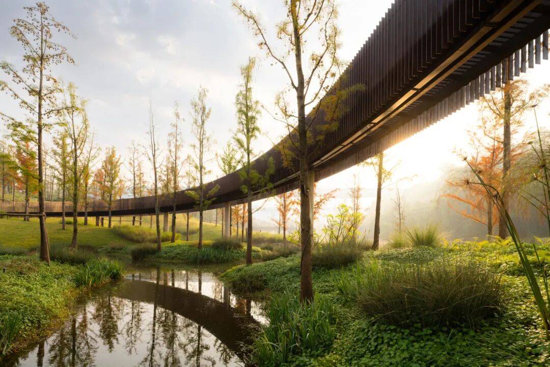 第一步,是生态基底的修复,书写与水共生的故事。设计团队制定了水生态规划的核心框架,重塑水岸线,适度扩大河面,引入一片水杉森林环抱场地,让水生植物与林木共同疗愈这片土地。