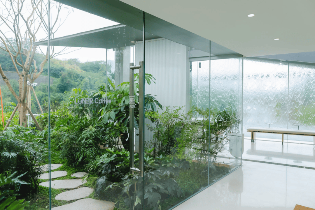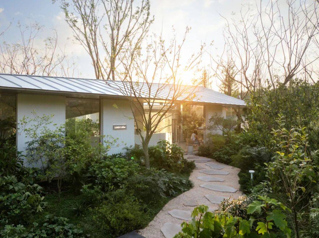 麓上咖啡厅则是设计的柔性补充。公园建设初期的方案中本无此空间,当公园雏形渐成,万华运营团队考量未来使用需求,决定增设这处小尺度室内空间。建筑与景观无缝融合,小尺度花园被植物簇拥,阳光透过枝叶洒入,营造出亲近温暖的休憩氛围。与大 尺度生态公园的开阔体验不同,这里的静谧与惬意,为游逛体验增添了更多元的情感维度。