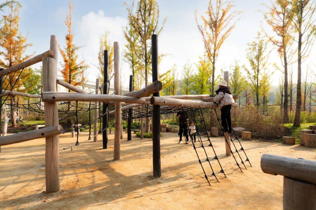 儿童区设置“木木乐园”自然探险设施,沙坑与攀岩墙激发创造力。