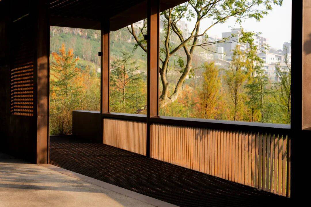 文化记忆延续:保留场地原生桉树林,通过栈道与透水铺装减少生态干扰,延续重庆山城“爬坡上坎”的生活意象。