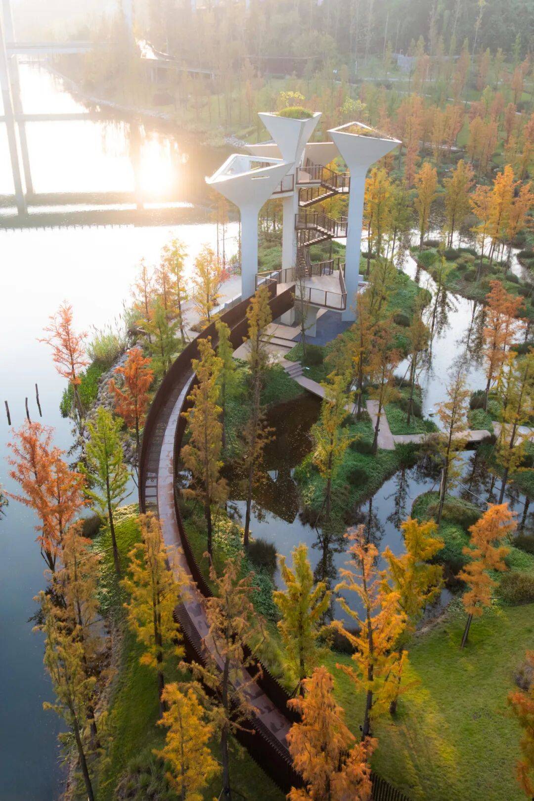 湿地观鸟塔:由四个三角形几何柱体组合而成,钢架楼梯串联观景高度,简洁语言融入密林。