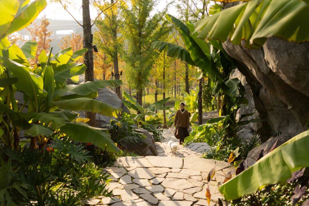 高差利用:临崖栈道保留崖壁与原生树木,以最小干预连接湿地与山地公园,营造“喧嚣与静谧”的魔幻交叠体验。