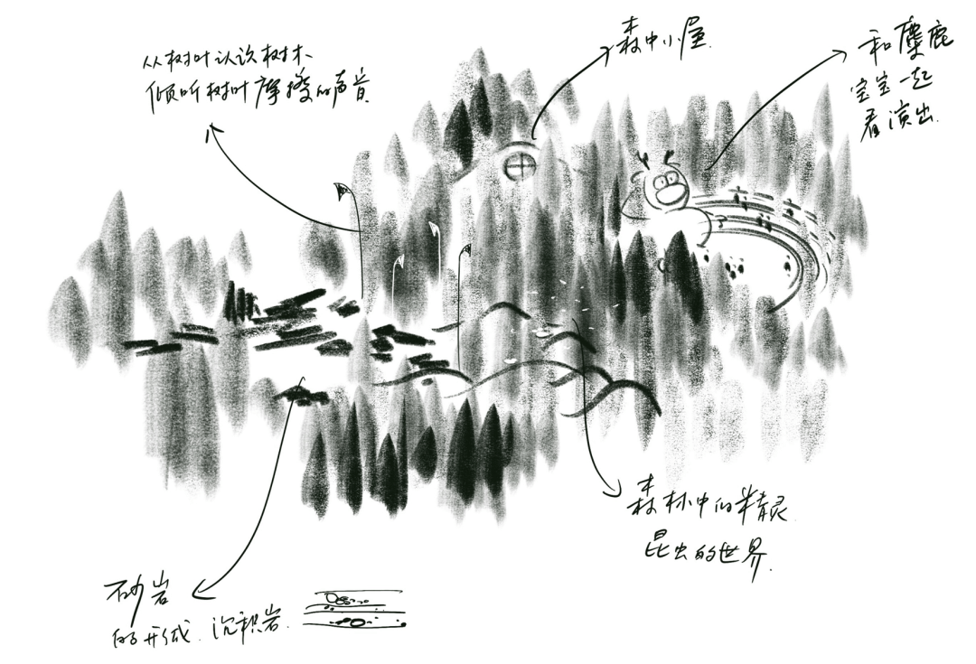 剧场空间:藏于密林深处,原木与原石材质搭配高迪风格曲线,激发儿童天性。