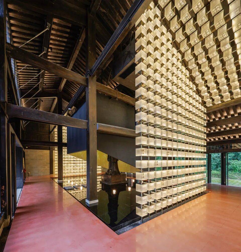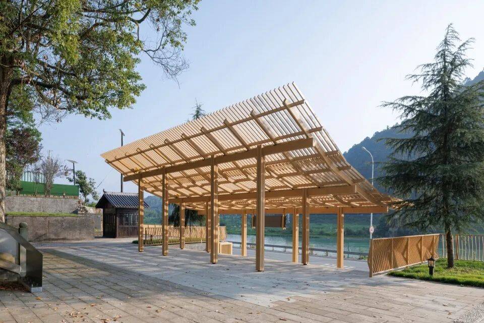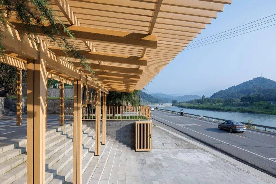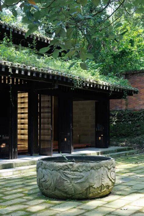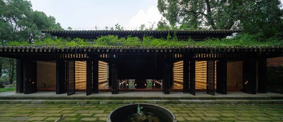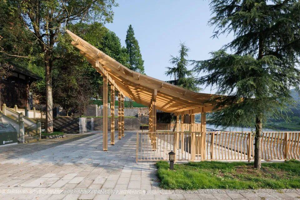 材料对话:浅木色新构筑与古祠深色形成对比,在绿树中成为“新地标”。