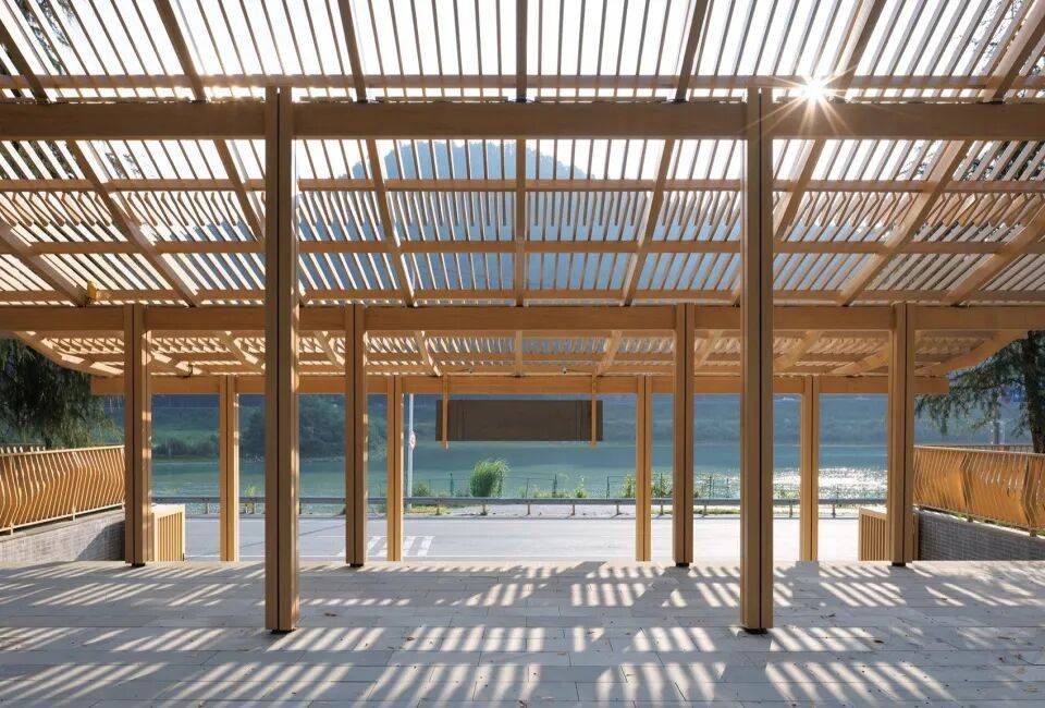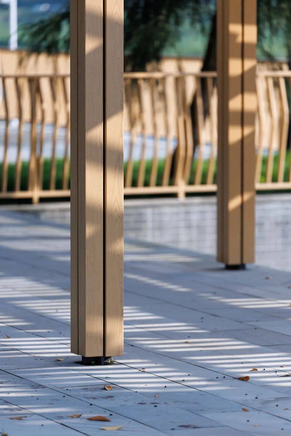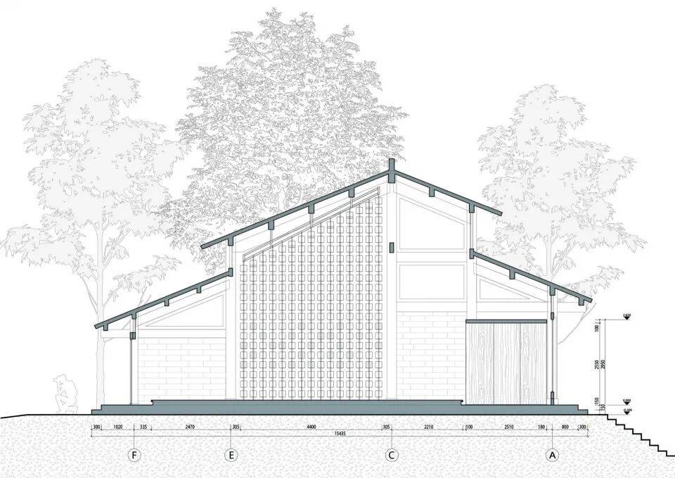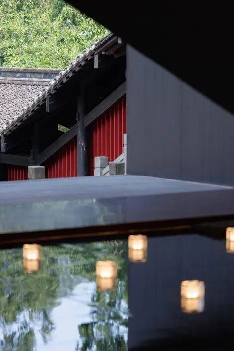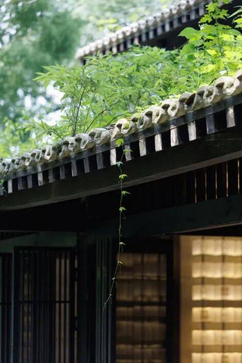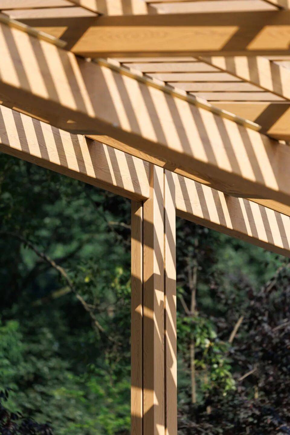 材料对话:浅木色新构筑与古祠深色形成对比,在绿树中成为“新地标”。
