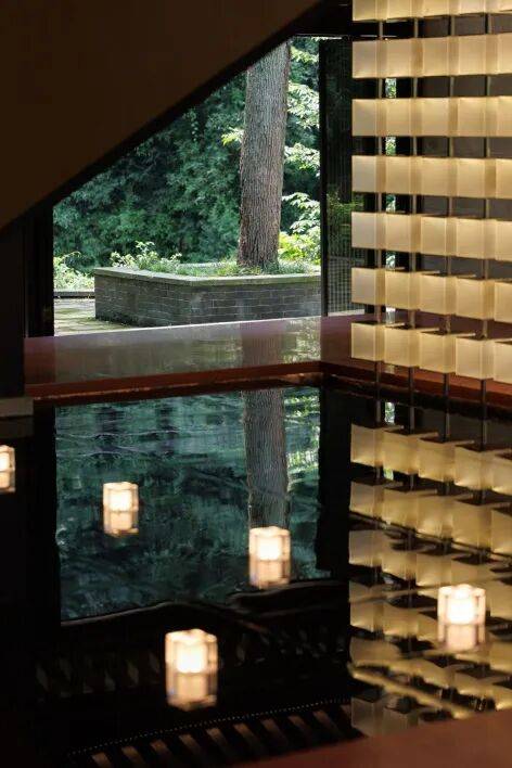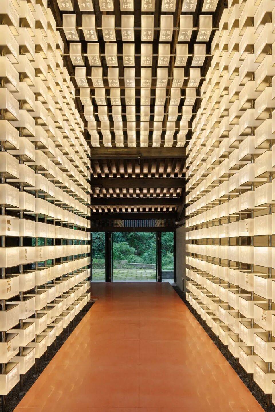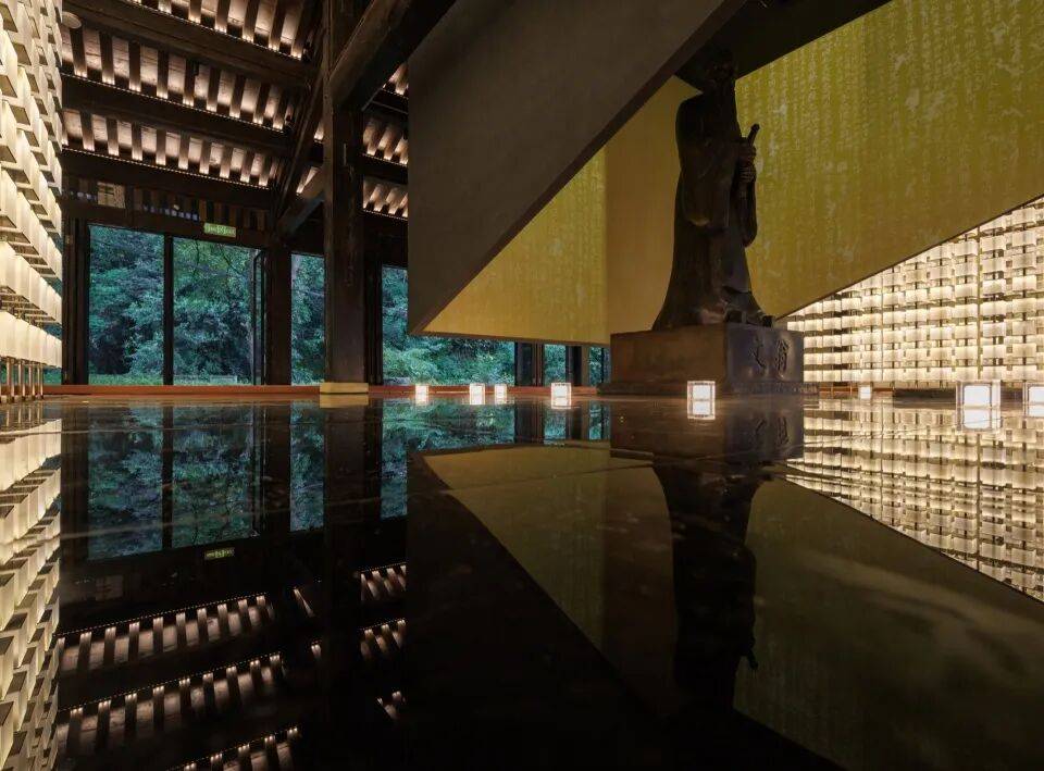 地面铺装:文翁像置于黑色亮面石材,水晶灯环绕形成“静水”效果;参拜步道用红色水磨石抬高,强化中心地位。