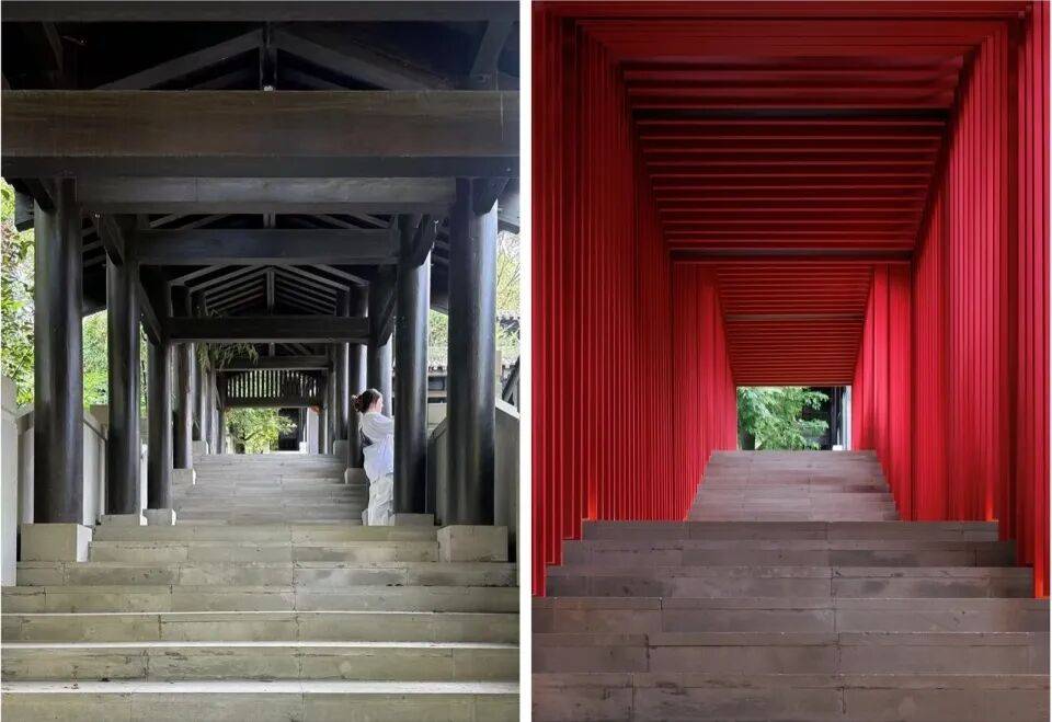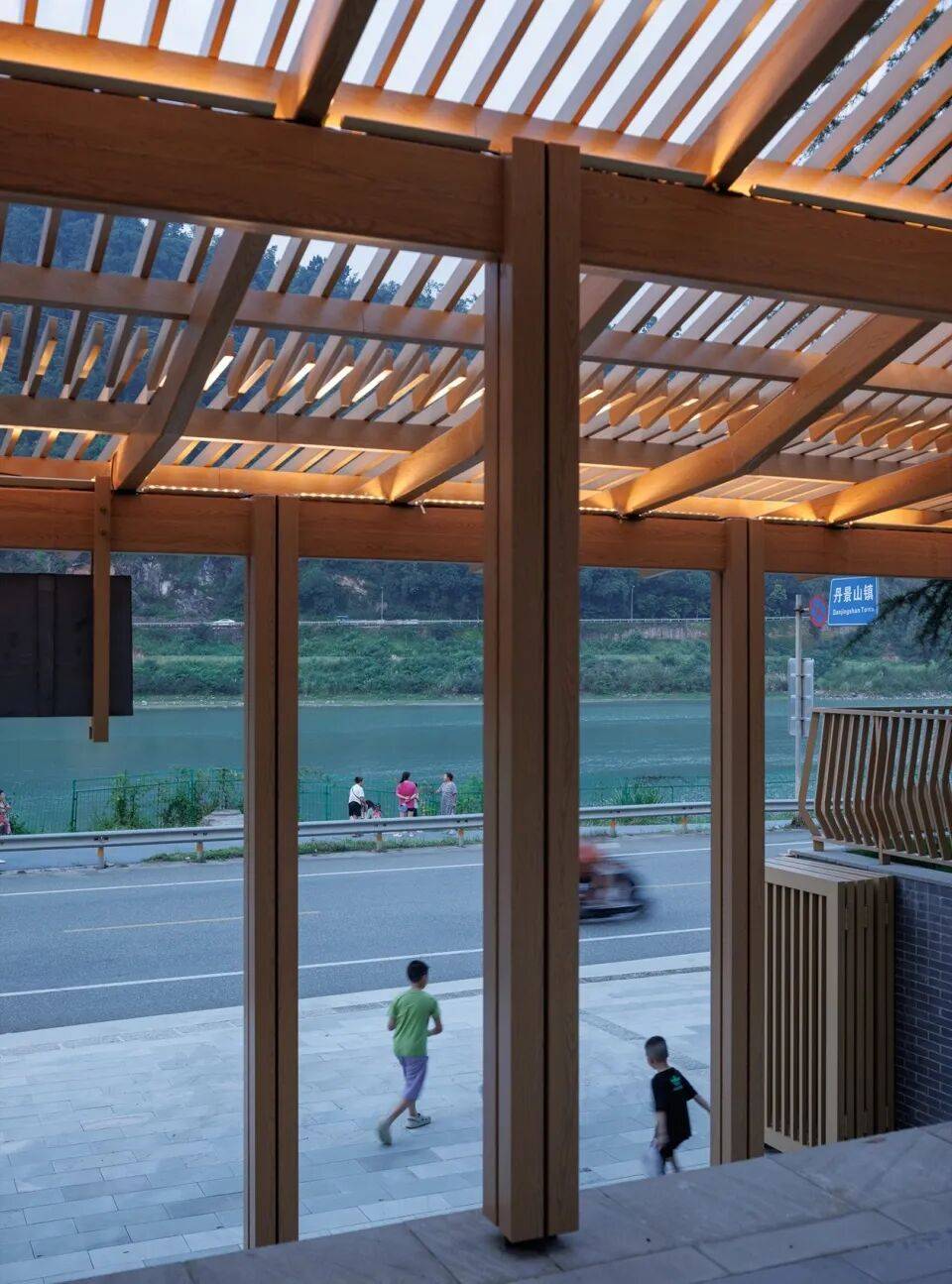 形态转译:将二维门转化为三维廊道,飞檐伸出道路侧,以“谦逊姿态”邀请游客进入。